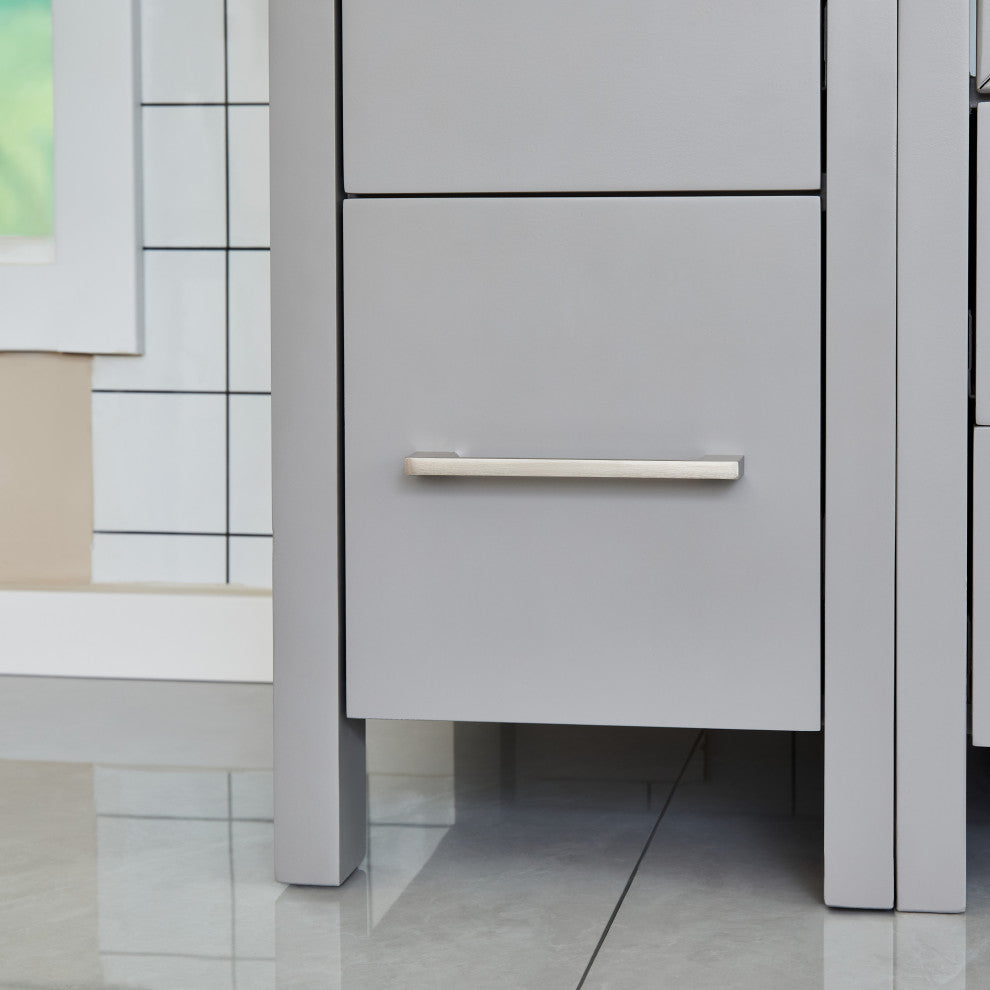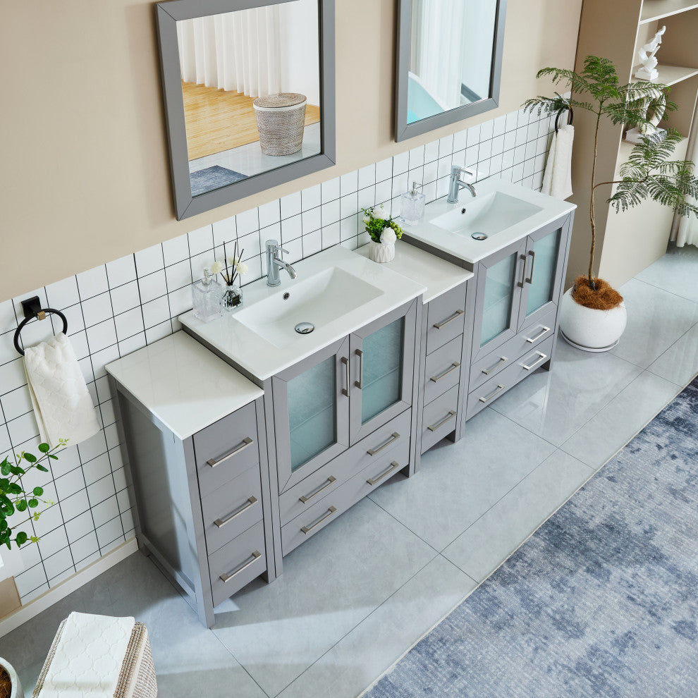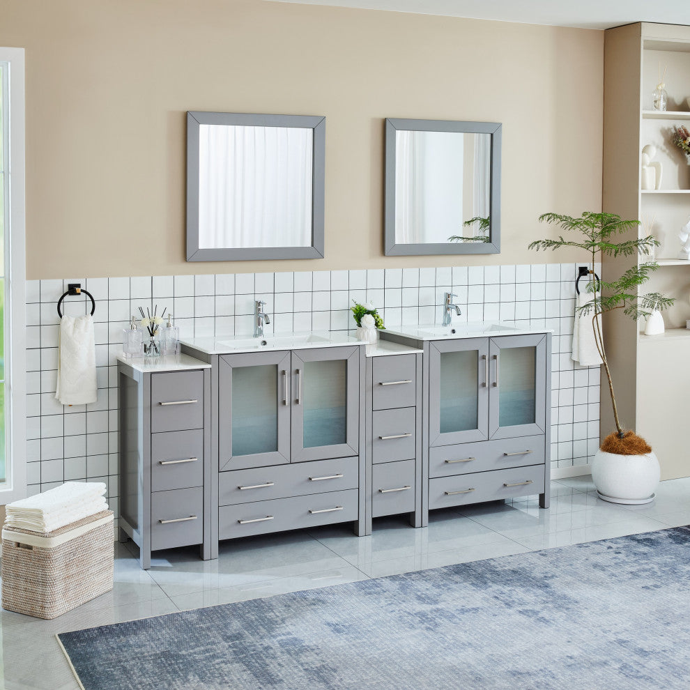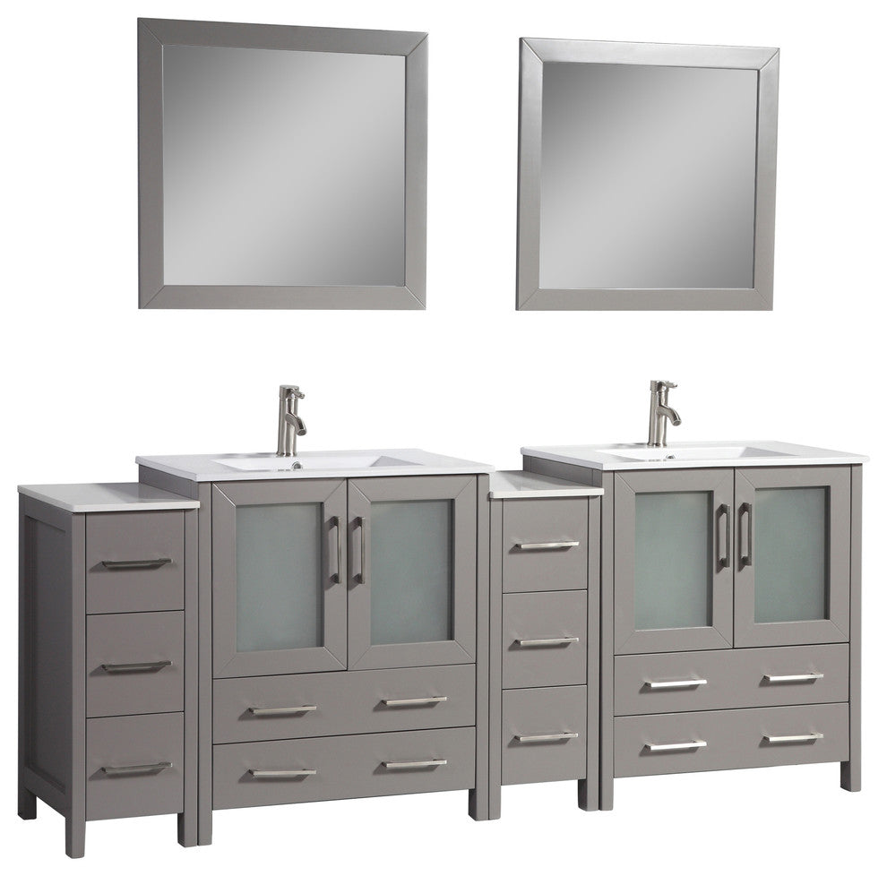 Let the clean-lined look of this vanity by Vanity Art guide your bathroom toward a cool, contemporary design. Double-sink vanity set with two 30" vanities and two 12" cabinetsIncludes 2 mirrors, countertop, sink basins and cabinet hardwareDoes not include faucetsCeramic countertopSoft-closing hardware1-year parts warranty against manufacture defectsColor: GrayMaterials: Solid + Manufactured Wood, MirrorMirror dimensions: W 29" x H 27.5"Cabinet dimensions: W 12" x D 18" x H 31"Vanity dimensions: W 30" x D 18" x H 35.8"Total dimensions: 84"�W x 18.1" D x 35.8" H