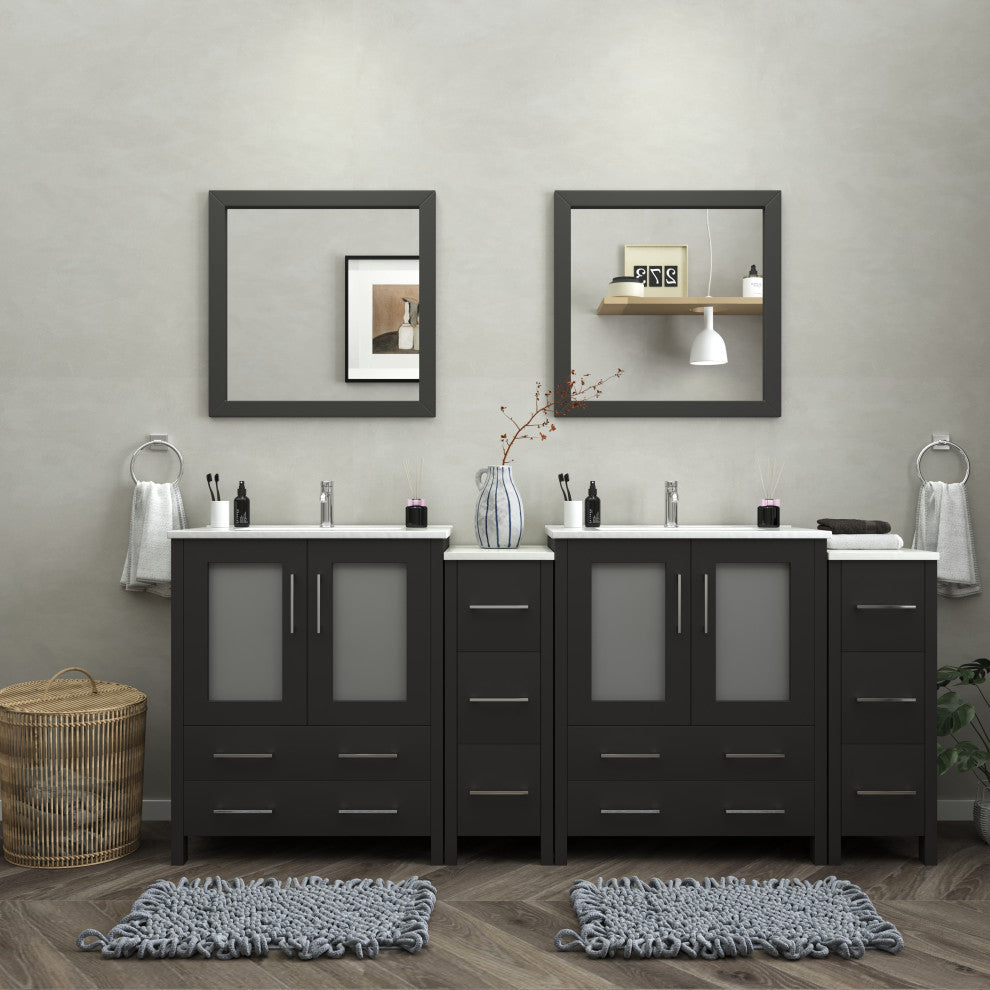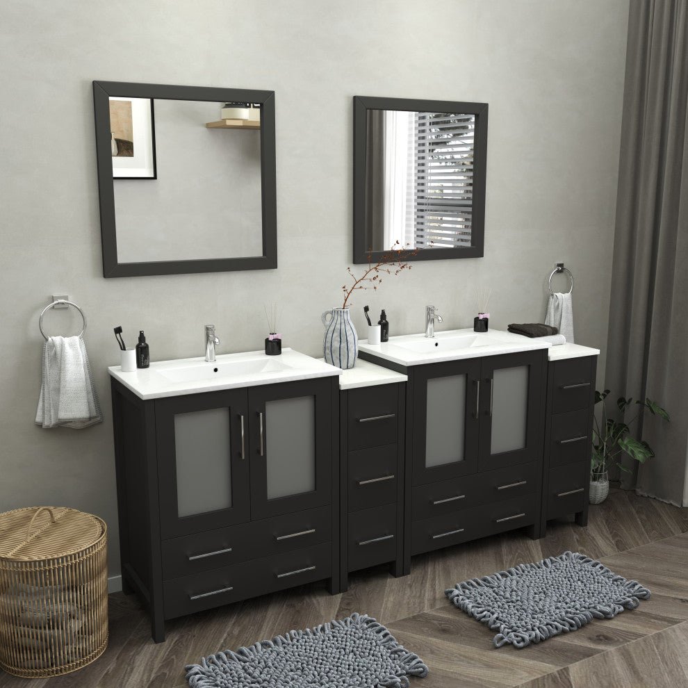 Let the clean-lined look of this vanity by Vanity Art guide your bathroom toward a cool, contemporary design. Double-sink vanity set with two 30" vanities and two 12" cabinetsIncludes 2 mirrors, countertop, sink basins and cabinet hardwareDoes not include faucetsCeramic countertopSoft-closing doorsDove-tailed drawersBrushed gold and brushed nickel handles/hardware1-year parts warranty against manufacture defectsColor: EspressoMaterials: Solid + Manufactured Wood, MirrorVanity Dimensions: 29.9" W x 18.1" D x 35.8" HMirror Dimensions: 27.56" x 27.56"Side Cabinet Dimensions: 11.8" W x 18.1" D x 33.5" HOverall Dimensions: 84"�W x 18.1" D x 35.8" H