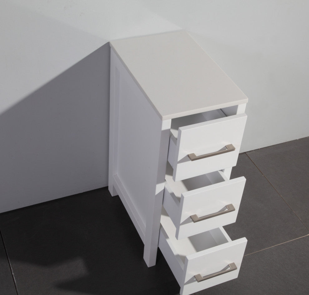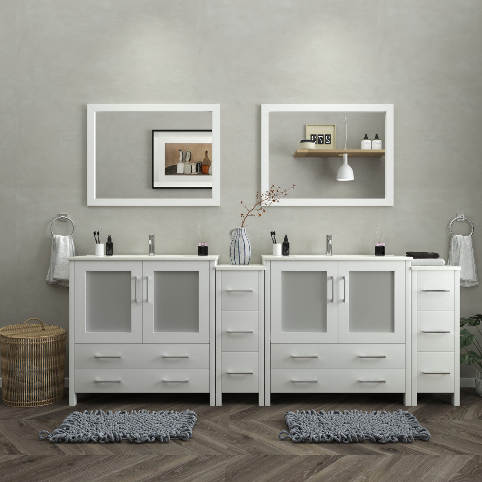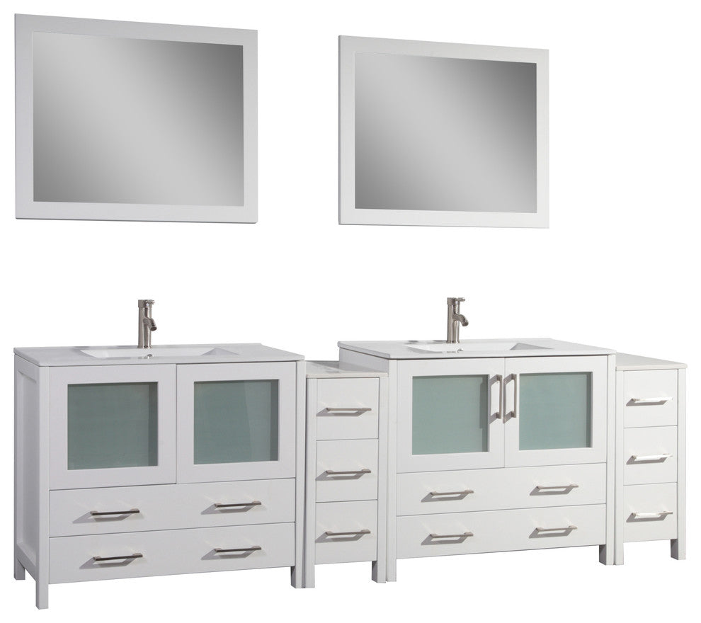 Let the clean-lined look of this vanity by Vanity Art guide your bathroom toward a cool, contemporary design. Double-sink vanity set with two 36" vanities and two 12" cabinetsIncludes 2 mirrors, countertop, sink basins and cabinet hardwareDoes not include faucetsCeramic countertopSoft-closing hardware1-year parts warranty against manufacture defectsColor: WhiteMaterials: Solid + Manufactured Wood, MirrorMirror dimensions: W 35" x H 27.5"Cabinet dimensions: W 12" x D 18" x H 31"Vanity dimensions: W 36" x D 18" x H 35.8"Total dimensions: W 96" x D 18" x H 35.8"