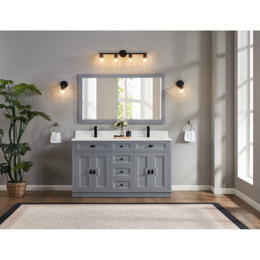 Dimensions: L:60 x W:22 x H:34.75Finish: Cadet1" artificial stone top, Ceramic sinkIncluded Faucet, Mirror and Wall LightingFaucet hole : 1Pre-drilled holeWood Material: Solid WoodHardware: Black1-year parts-only warranty on manufacturer defects