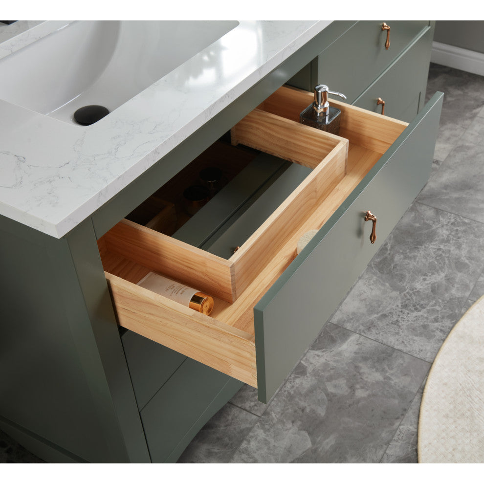 Dimensions: L:60 x W:22 x H:34.75Finish: Pewter Green1" artificial stone top, Ceramic sinkIncluded Faucet, Mirror and Wall LightingFaucet hole : 1Pre-drilled holeWood Material: Solid WoodHardware: Black1-year parts-only warranty on manufacturer defects