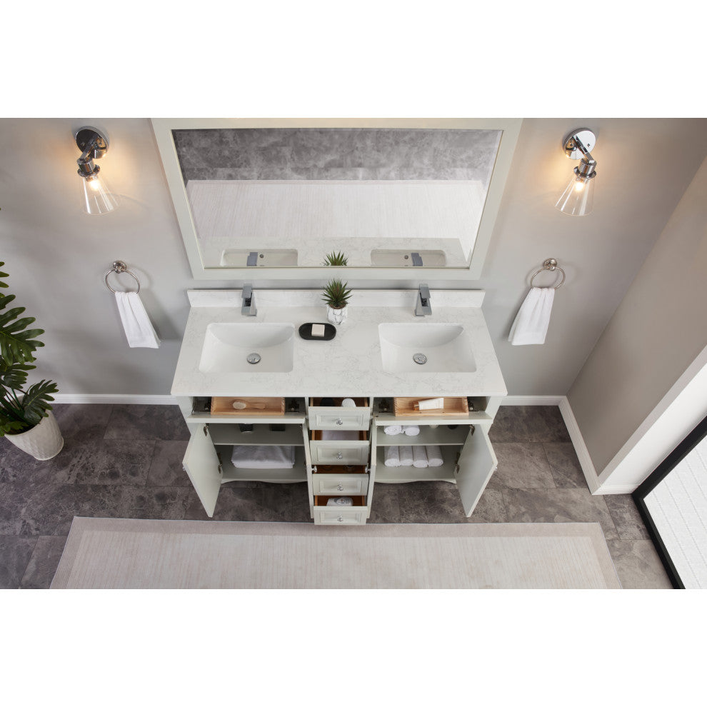 Dimensions: L:60 x W:22 x H:34.75Finish: Silver Strand1" artificial stone top, Ceramic sinkIncluded Faucet, Mirror and Wall LightingFaucet hole : 1Pre-drilled holeWood Material: Solid WoodHardware: Chrome1-year parts-only warranty on manufacturer defects