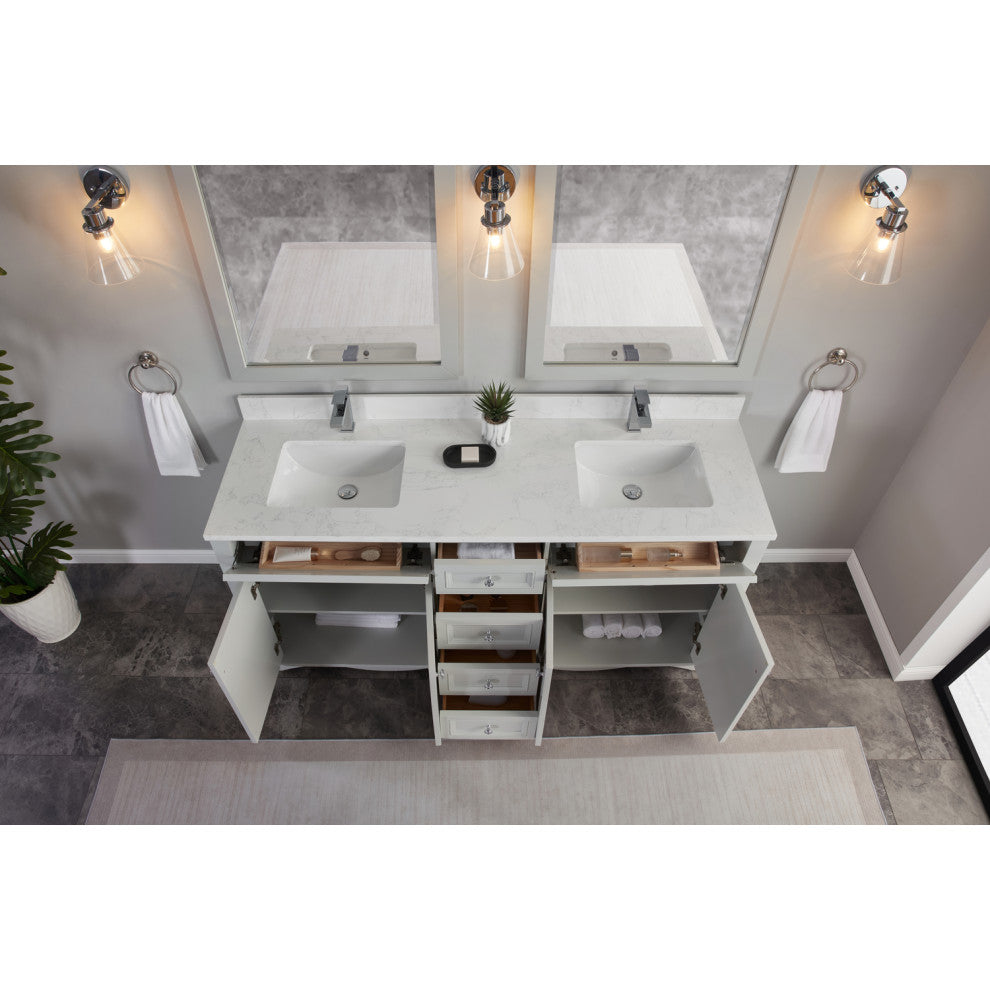 Dimensions: L:72 x W:22 x H:34.75Finish: Silver Strand1" artificial stone top, Ceramic sinkIncluded Faucet, Mirror and Wall LightingFaucet hole : 1Pre-drilled holeWood Material: Solid WoodHardware: Chrome1-year parts-only warranty on manufacturer defects