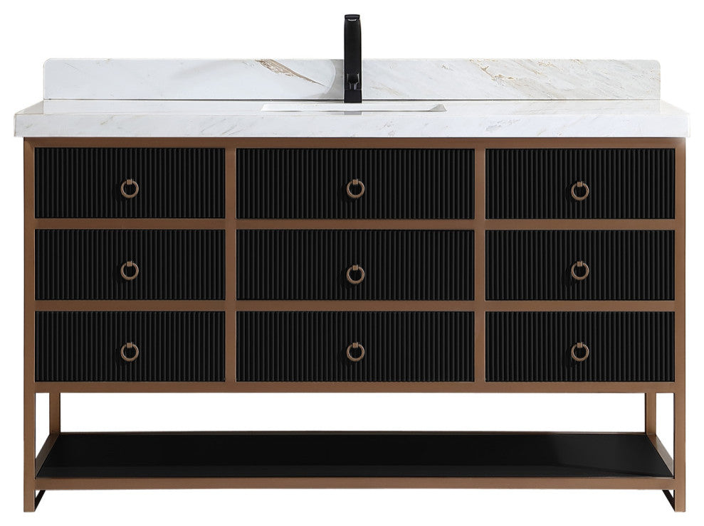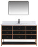 Dimensions: L:60 x W:22 x H:35.4Finish: Tricorn Black2" Natural Marble top, Ceramic sinkFaucet: Not IncludedFaucet hole : 1 Pre-drilled holesWood Material: Oak Wood1-year parts-only warranty on manufacturer defects