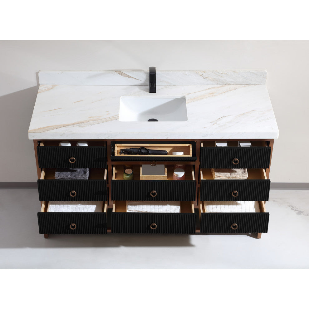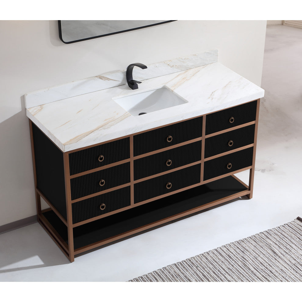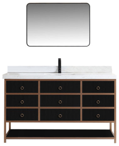 Dimensions: L:60 x W:22 x H:35.4Finish: Tricorn Black2" Artificial top, Ceramic sinkFaucet: Not IncludedFaucet hole : 1 Pre-drilled holesWood Material: Oak Wood1-year parts-only warranty on manufacturer defects