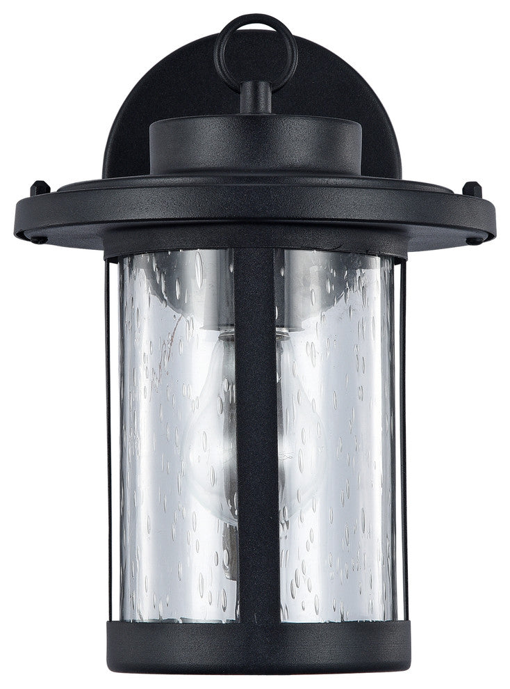 This 1-light outdoor wall sconce features a textured black finish that will complement many transitional decors. The clear seedy glass cylinder allows the light to bounce in different ways and creates a warm welcoming glow to the outside of your home.