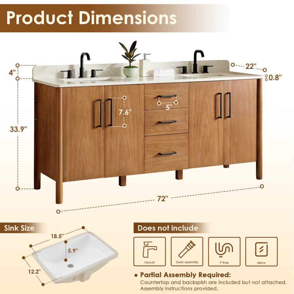 With an impeccable blend of rustic warmth and modern industrial style, our Velora Bathroom Vanity is an exquisite medley of textures, colors, and materials. It''s rich in thoughtful details like rounded cabinet legs, soft countertop edges, and unique threaded handles. Offering generous and functional storage with customizable drawer partitions, the Velora balances fine design details with everyday practicality. It''s the perfect accent for any modern bathroom.FeaturesDurable, high-quality materials: Constructed from a trio of solid kiln-dried poplar wood, pine wood, and plywood, ensuring supreme quality and sturdiness.Stunning finish: Cabinet comes in an alluring Mango Brown finish that reveals the natural wood grain beneath, bringing a warm and exquisite charm to your bathroom decor.Rounded vanity legs: Smooth, rounded cabinet legs ensure stability and durability while adding a subtle touch of classic elegance.Rounded-edge countertop: 0.8"-thick, Grain White engineered stone countertop with rounded corners provides a clean, high-end look while enhancing safety. A matching 4" backsplash protects your wall from sink splashes.Sleek, undermount sink: Double, rectangular, undermount ceramic sink with overflow integrates with the countertop for a seamless and clean appearance.Faucet type: Countertop comes with pre-drilled standard 8" widespread faucet holes for installation convenience. (Faucet sold separately)U-shaped shelf: Intelligently designed shelf beneath the sink allows for easy plumbing installation and provides a convenient organization solution.Soft-closing design: Protective soft-close hinges and slides ensure smooth operation and reliable performance, preventing the door and drawers from slamming shut.Ample storage: 4 soft-closing doors and 3 soft-closing drawers with full extension slides and dovetail joints serve to maximize your bathroom storage space.Customizable organization: Removable partitions offer a handy 5-in-1 storage solution, allowing you to keep your bathroom essentials tidy, organized, and tucked away.Striking threaded handles: Made from corrosion-resistant zinc alloy, the handles feature a Matte Black threaded finish to add a touch of bold contrast and refinement.Optional matching mirror: Single, functional LED mirror in Matte Black creates a balanced aesthetic. (Note: Mirror available upon purchase of the set.)Partial assembly required: Countertop and backsplash are included but not attached. Assembly instructions provided.Without MirrorDo keep the countertop as dry as possible.Do recommend to only use water to wash the artificial marble top(no mild dish soap, cleaner, detergent), and try the countertop by soft cloth as soon as possible.
