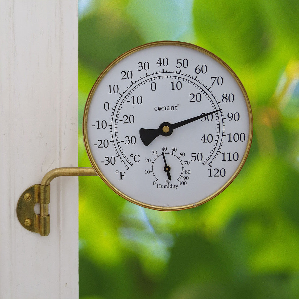 The classic Vermont Weather Station (in brass) makes a handsome and practical addition to outdoor Decor. On a large, easy-to-read scale, a thermometer of the brass weather station measures temperature in both Fahrenheit and Celsius. There is also a hygrometer located on the lower portion of the dial on the brass weather station that measures humidity. The brass weather station is complete with a 3.5 inch long swivel arm and mounting bracket for trouble-free installation. The brass weather station is also perfect for placing outside a window so it peers in. Crafted of solid brass with a living finish (over time this product will age beautifully into a nice patina and eventually, a desirable verdigris.) Lifetime Guarantee.4" Dial Face with Large numeralsSwivel Arm Mounting Bracket with matching hardwareSolid Brass & Glass ConstructionLiving Finish BrassSeparate Hygrometer DialPrecision Japanese CoilsMeasures both Fahrenheit and CelsiusEasy to Read at a GlanceAdjustable for Just the right Angle Durable, attractive finish; tube won''t yellow or crazeWon''t Peel, Flake or Rust; Patinas with ageMonitors Temperature and HumidityReliable, Accurate Temperature Readings Warranty: Lifetime