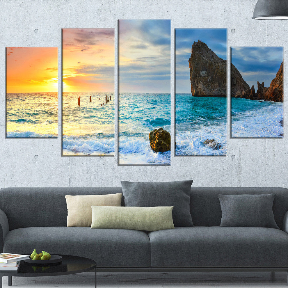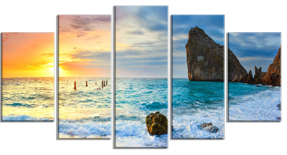 "Vibrant Morning Sea With Yellow Sun" Seashore Wall Art, 5 Panels, 60"x32"