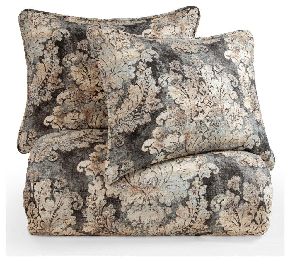 Capturing the old-world elegance of damask, our Victoria Collection is a modern reimagining of traditional designs. The smoky damask print inspires a romantic, painterly feel, blending hues of gray, cream, tan, light blue, and rust for a touch of antique. With a soft drape and lofty weight, this bedding set adds a sense of calm and tranquility to any bedroom.What''s Included1 Duvet Cover + 2 Pillow ShamsDimensionsQueen - Duvet: 92" x 96"; Pillow Shams: 21" x 27"King - Duvet: 110" x 96"; Pillow Shams: 21" x 34"MaterialsFace: 70% viscose, 30% linen; Back: 100% cottonCareMachine wash cold, gentle cycle. Tumble dry low.