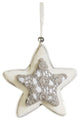 Plush star ornament is accented in the middle with gray lace and sparkling white glitterEdging on the star is outlined with a silver zipperOne-sided lace designComes ready-to-hang on a sheer white ribbonDimensions: 5"H x 5"W x 1.5"DMaterial(s): fabric/cotton/metal/plastic