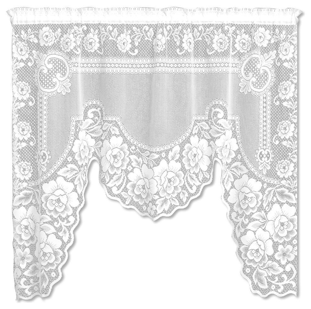 A transitional pattern for windows and tabletops, at home in the parlor or the country. A beautiful multiflora design is featured at the center of window treatments and home textiles, with lovely rose trim around the edges. Machine wash. Made in U.S.A. 100% polyester. Machine wash cold, gentle. Do not bleach. Lay flat or hang to dry. Touch up with cool iron if desired. 1" Header 1.5" Rod pocket Medium-gauge lace
