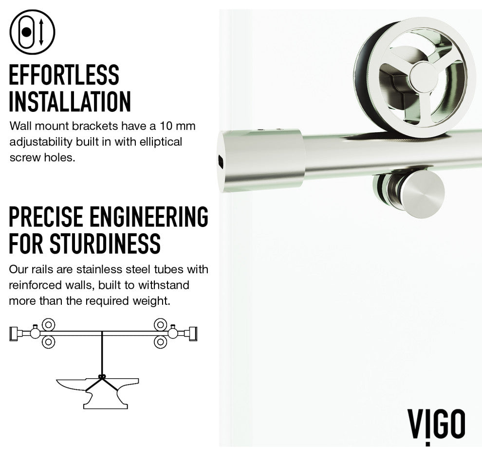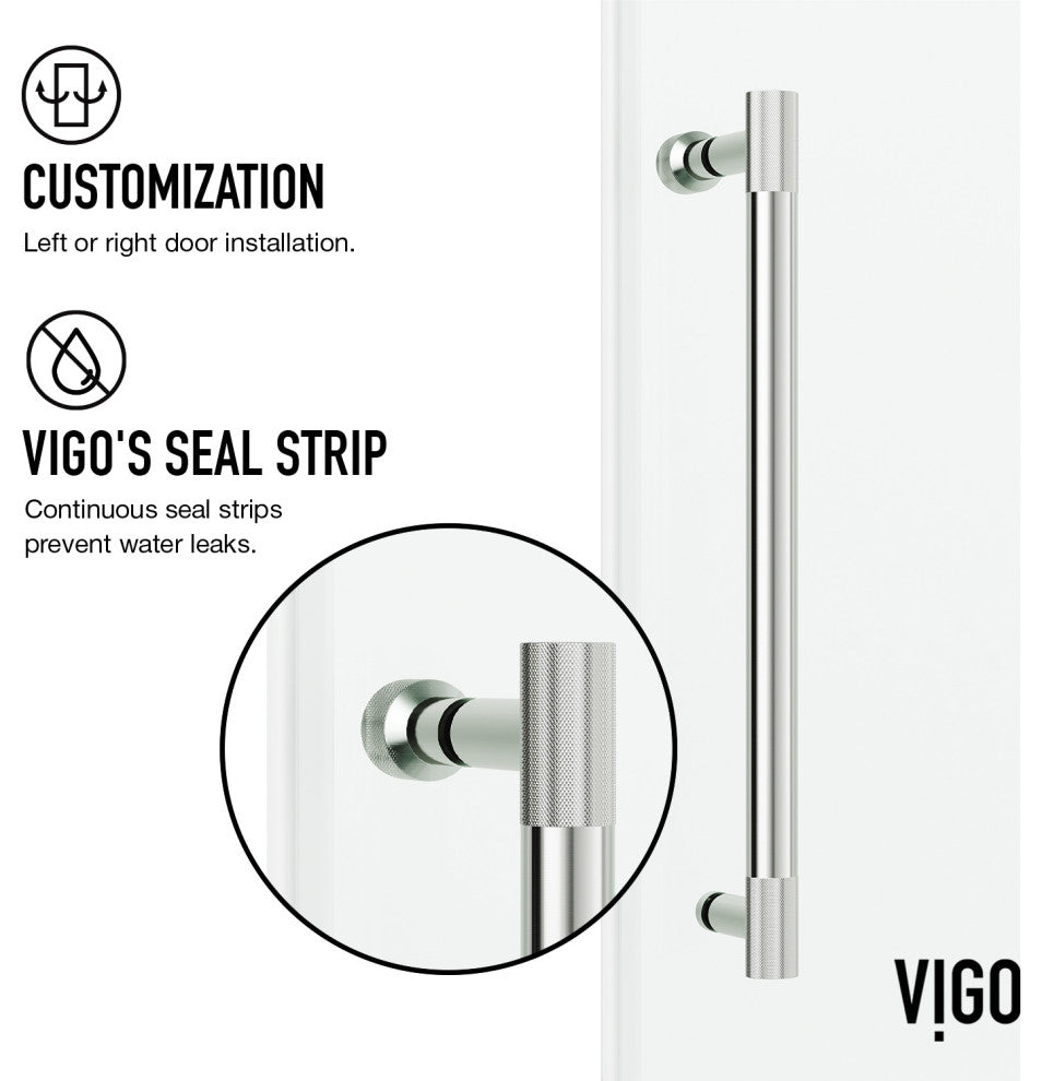 Experience a quieter, more relaxing shower experience with The Elan Cass Aerodynamic Collection by VIGO. Elan Cass is home to a frameless glass sliding bathtub door with sleek aerodynamic rollers that deliver a smooth, air gliding open and closure. The rich stainless steel finished hardware with the vertical door handle adds beauty to the high-quality glass doors, providing an effortless shower entry. Choose between the left or right-side door opening for a custom installation for any bathroom style. Upgrade your shower experience today with the Elan Cass Aerodynamic Collection.Features:• EASY INSTALLATION: Left or right-side opening provides versatility for various bathroom floorplans. All parts and mounting hardware are included in the packaging, offering a lifetime of stability while fully supporting wall anchoring.;• EASY TO CLEAN: premium stainless steel constructed hardware for ultimate durability and easily wipes clean for a lasting sheen;• HIGH-QUALITY MATERIAL: Obtain a premium look at an affordable cost without sacrificing quality or performance. The leak-free design with VIGO hardware finishes ensures lasting durability.;• AMPLE ACCESS: Fixed panel with sliding glass bathtub door allows for easy entry. The door assembly features a quiet sliding system made possible by the sliding rollers and slim top rails.;• SEAL STRIP: full-length seal strips prevent water leaks and keep your bathroom floors dry.;• TEMPERED GLASS: Spot-resistant and incredibly safe, this glass resists dangerous breakage and shards and is pre-drilled for handle installation.;Measurements:• Assembled Width: 60;• Assembled Depth: 2.75;• Assembled Height: 66;Details:• SILENT SLIDING: aerodynamic rollers deliver a quieter shower experience.;• FLEX-SIZING TM: The flex-sizing allows 4 inches of horizontal adjustability during installation to ensure this tub door fits your space.;• LOCK TRACK TM: sliding bathtub door features aerodynamic rollers for swift, air gliding open and close for stability and anti-jump.;• FINISH PLATED TM: ensures the finish is consistent throughout the entire product without inconsistencies.;• LEAK-PROOF: a single water deflector redirects water toward the inside of the tub.;• PREMIUM FINISH: VIGO"™s 7-layer coating ensures long-lasting brilliance that resists rust, corrosion, and tarnish.;• ALL PARTS INCLUDED: All mounting hardware included in the packaging.;Certifications&Warranty:• All VIGO bathtub doors have a Limited Lifetime Warranty;• ANSI Z97.1 and 16 CFR 1201-certified glass;
