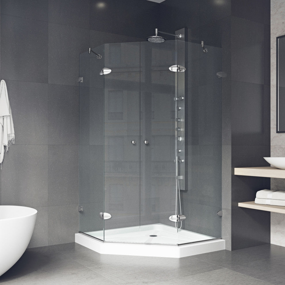 Clean and timeless, The Gemini by VIGO is a sleek neo-angle shower enclosure. Elegant French doors add a touch of sophistication to its unobstructed design. Premium finished hardware adds a touch of shine to thick tempered glass. High-quality stainless steel and solid brass hardware ensure lasting durability. Elegant round doorknobs on both sides ensure seamless walk-in shower entry. Engineered with VIGO''s exclusive technologies, it features continuous seal strips along the door to prevent leaks. Functionality meets luxury with The Gemini promise a spa-like shower experience.