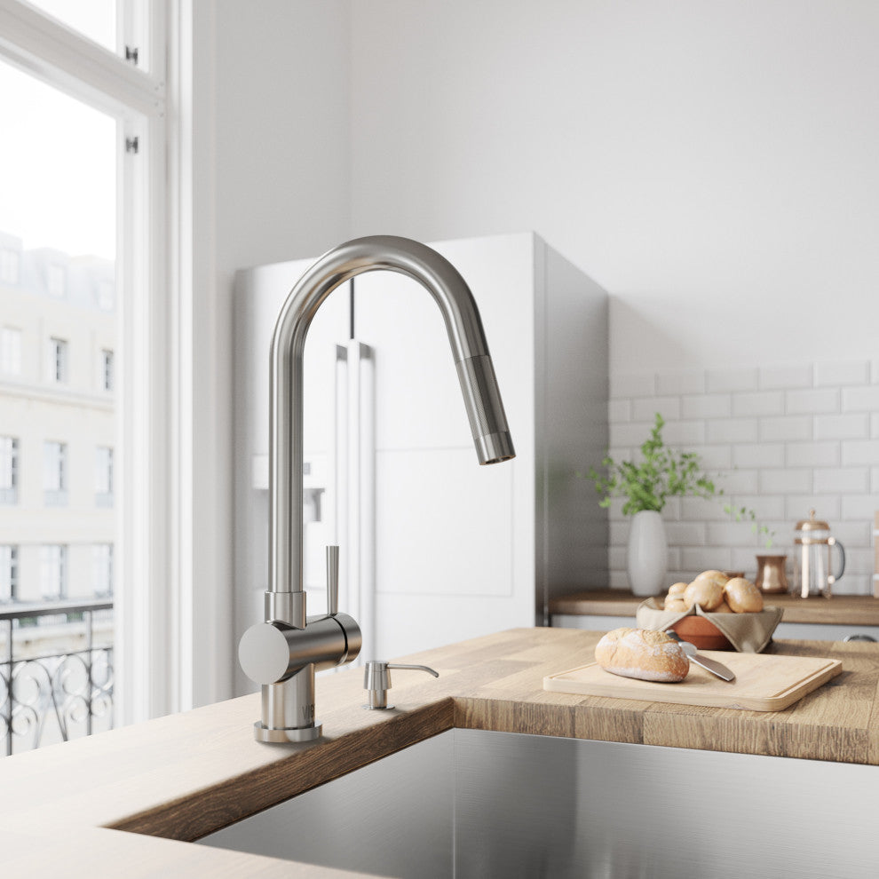 A mix of textures and a high arch defines The Gramercy by VIGO. Its sleek design complements any home decor and transcends design trends. Diamond knurling adds contrast to VIGO''s smooth premium 7-layer finish. Ergonomic features like the pull-down head and 360-degree swivel spout provide optimal maneuverability. Its solid brass construction delivers a lifetime of powerful performance. Its single handle lever ensures seamless, Sleek yet practical, this kitchen faucet is a must-have for your home. The Gramercy provides an exceptional kitchen experience.