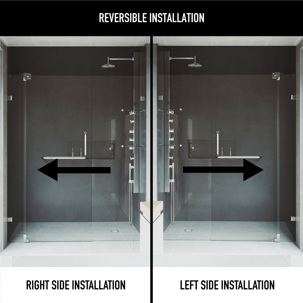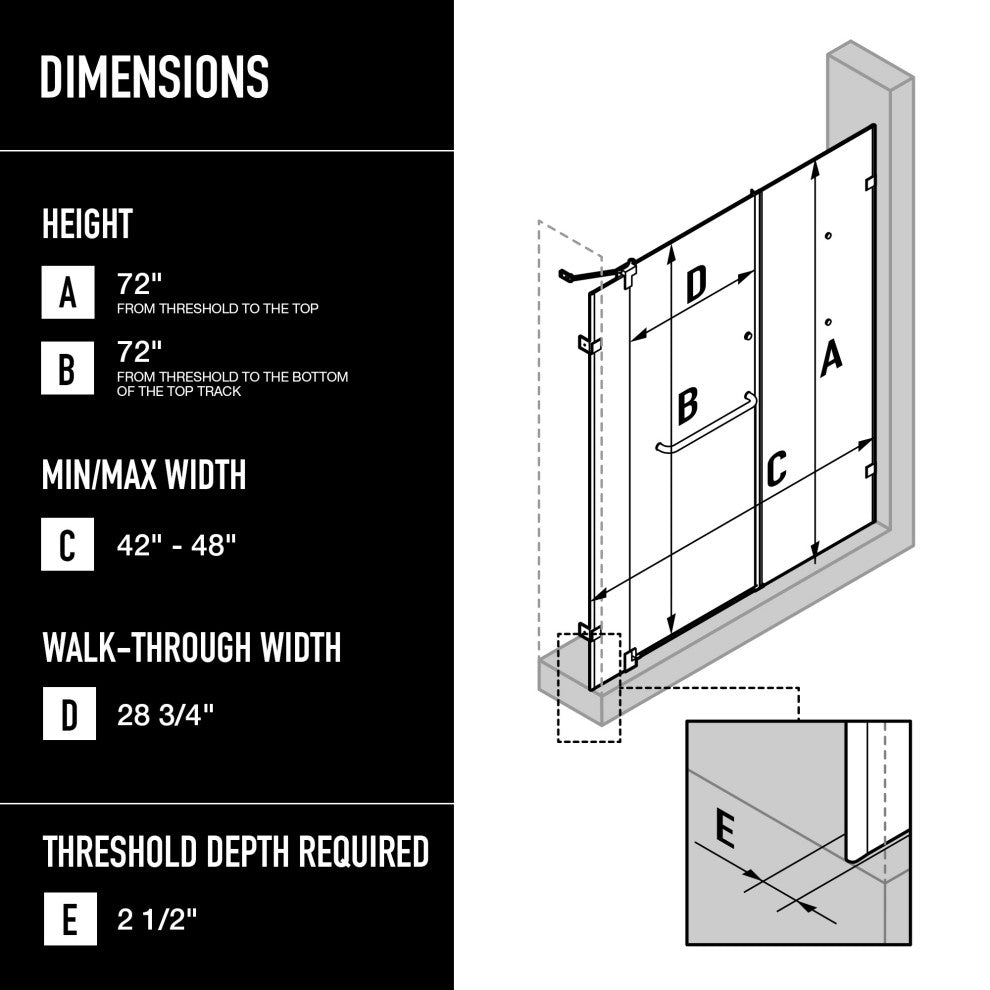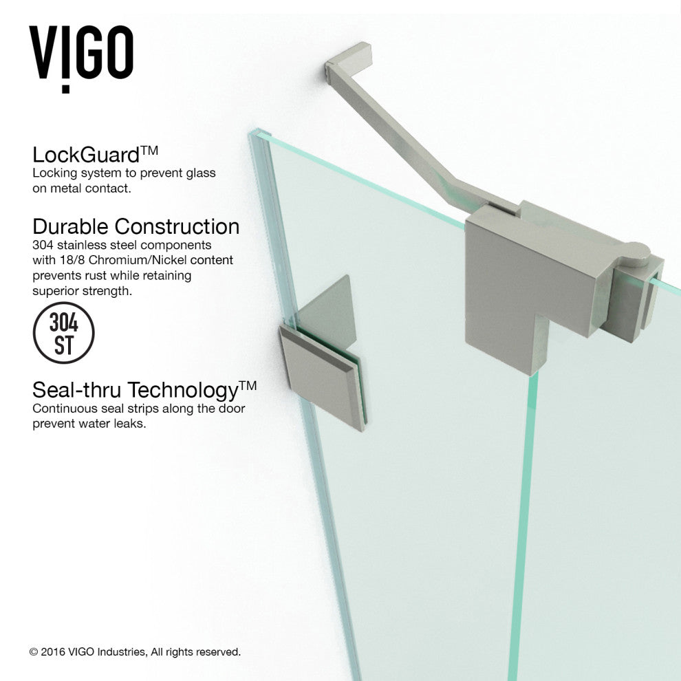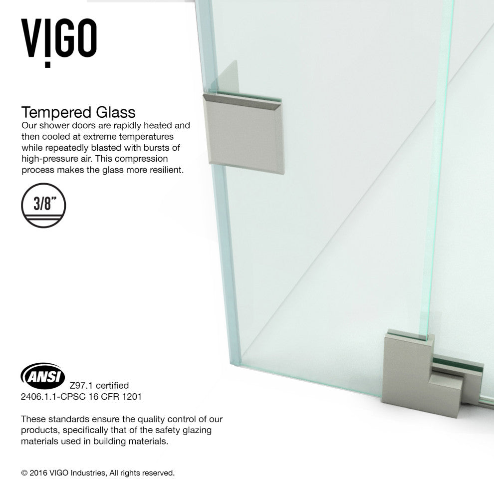 The unique pivoting door system on the VIGO Pirouette Frameless Pivot Shower Door is a safe and effective way to update your modern bathroom. Made from the highest quality stainless steel and durable tempered glass, this shower door features a sleek door handle and matching towel bar for added convenience. To your preference, this door can be installed to open from the left or right side. The towel bar and door handle are also reversible so you can customize your shower door even further.Features:• MAGNALOCK TM: Full length magnetic catch keeps door tightly closed and prevents water from leaking out;• SEAL-THRU TM: Strong top and bottom seal strips along the entire length of the door prevent water from leaking out;• FLEX-SIZING TM: offers 6 in. of horizontal adjustability during installation to fit your space;• SMART ADJUST TM: accommodates walls that may shift over time;• FINISH PLATED TM: ensures the hardware finish is consistent throughout and guaranteed to match all other VIGO products;• UNIQUE PIVOT SYSTEM: Pivoting hinges allow door to pivot and swing open outward for easy, walk-in shower entry;Measurements:• Assembled Width: 48;• Assembled Depth: 3;• Assembled Height: 72;Details:• REVERSIBLE DOOR HANDLE: Towel bar and door handle are reversible;• CONVENIENT SHELVES: Two built-in shelving units provide room to easily store bath products;• PREMIUM FINISH: VIGO"™s 7-layer coating ensures long-lasting brilliance that resists rust, corrosion and tarnish;• QUALITY HARDWARE: stainless steel and brass constructed hardware ensures optimal performance;• TEMPERED GLASS: 3/8-inch thick ANSI and 16 CFR 1201-certified clear tempered glass;• FRAMELESS DESIGN: Void of cumbersome frames, leaving customers with the beauty of clear, tempered glass;• REVERSIBLE INSTALLATION: left or right-side opening provides versatility for various bathroom floorplans;• IMPACT FREE: This shower door is intelligently engineered so metal and glass do not make hard contact;• OUT OF PLUMB ADJUSTABILITY: 10 mm of built-in depth adjustability maintain door''s alignment;• ALL PARTS INCLUDED: all parts and mounting hardware is included in packaging;• FRUSTRATION FREE: user-friendly installation guide with supports seamless, one-day installation;Certifications&Warranty:
