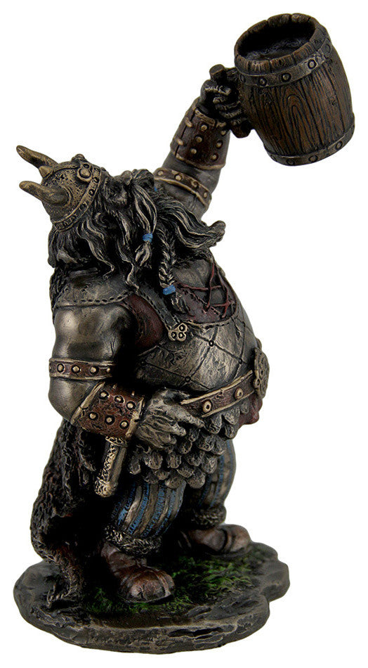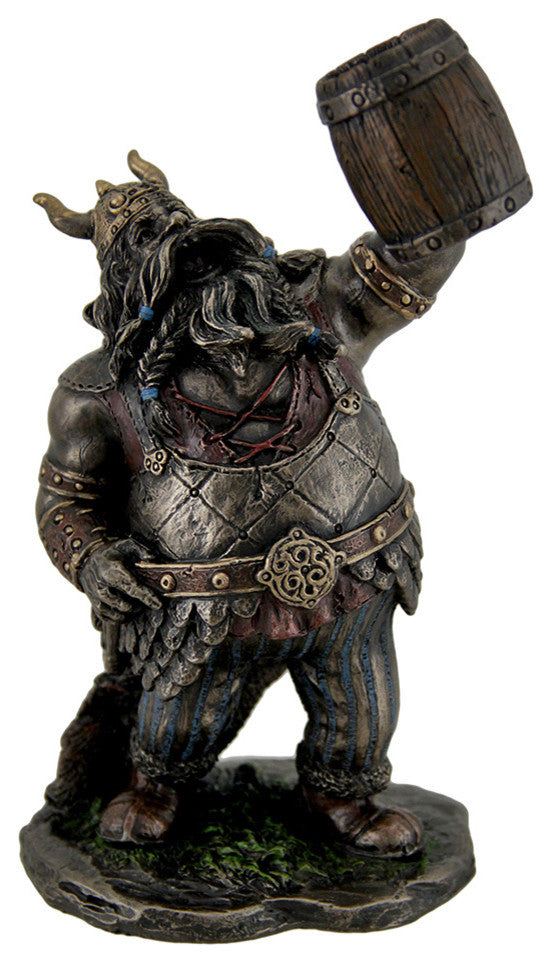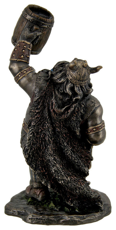 Norse lore tells that Viking warriors fought hard, and partied even harder. This wonderful statue depicts a Viking warrior toasting his brothers who have gone to Valhalla. Made of cold-cast resin, the figure measures 7 inches tall, 4 inches long, and 3.5 inches wide. His metallic bronze finish is hand-accented with red and green enamels. He''ll make a great gift for Viking enthusiasts.