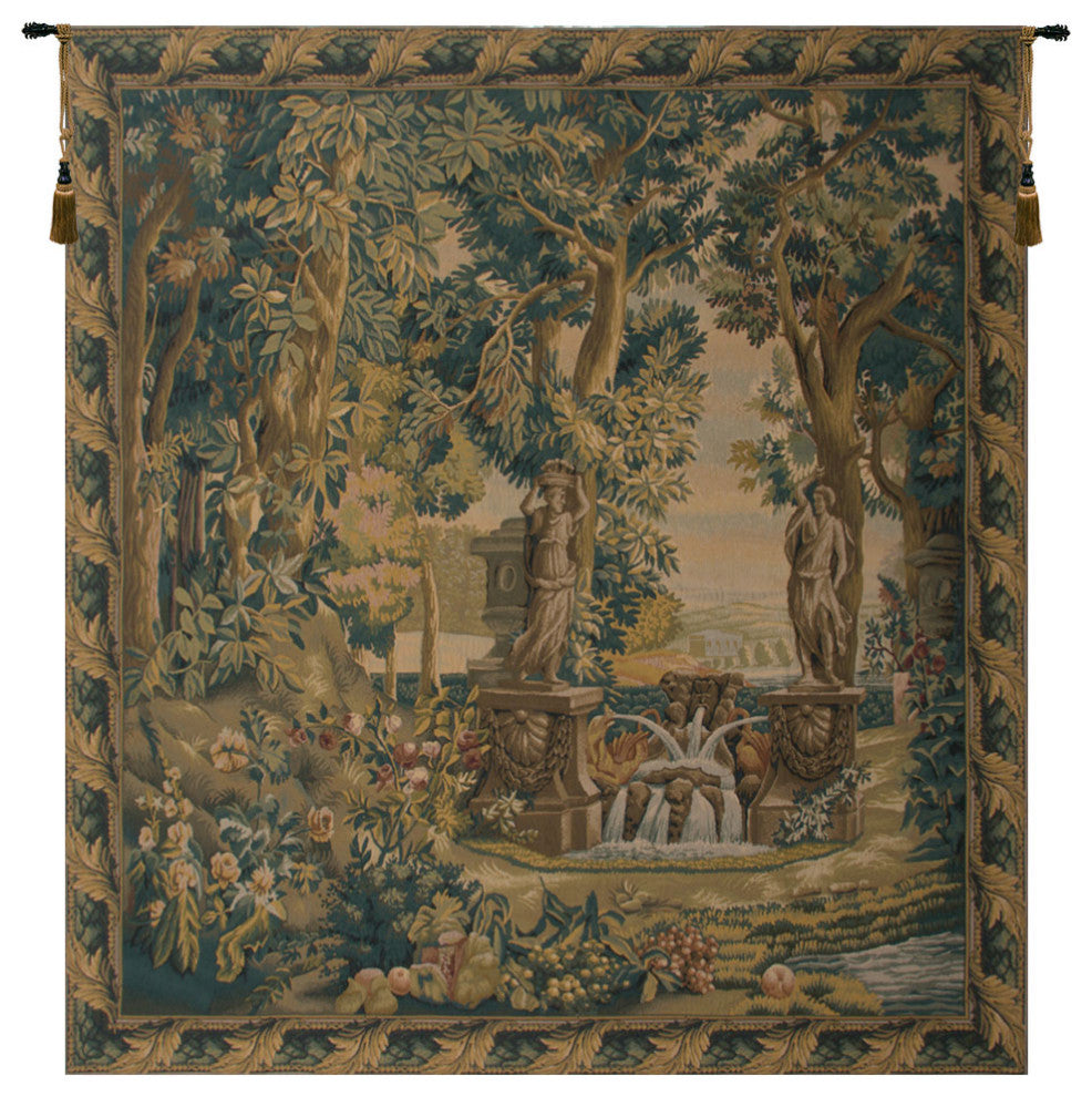Villa Garden Classic is a Belgian made jacquard wall tapestry. The design depicting formal Italianate gardens with ornate fountains comes from an original Verdure Gobelin tapestry woven at Oudenaarde in Flanders.
