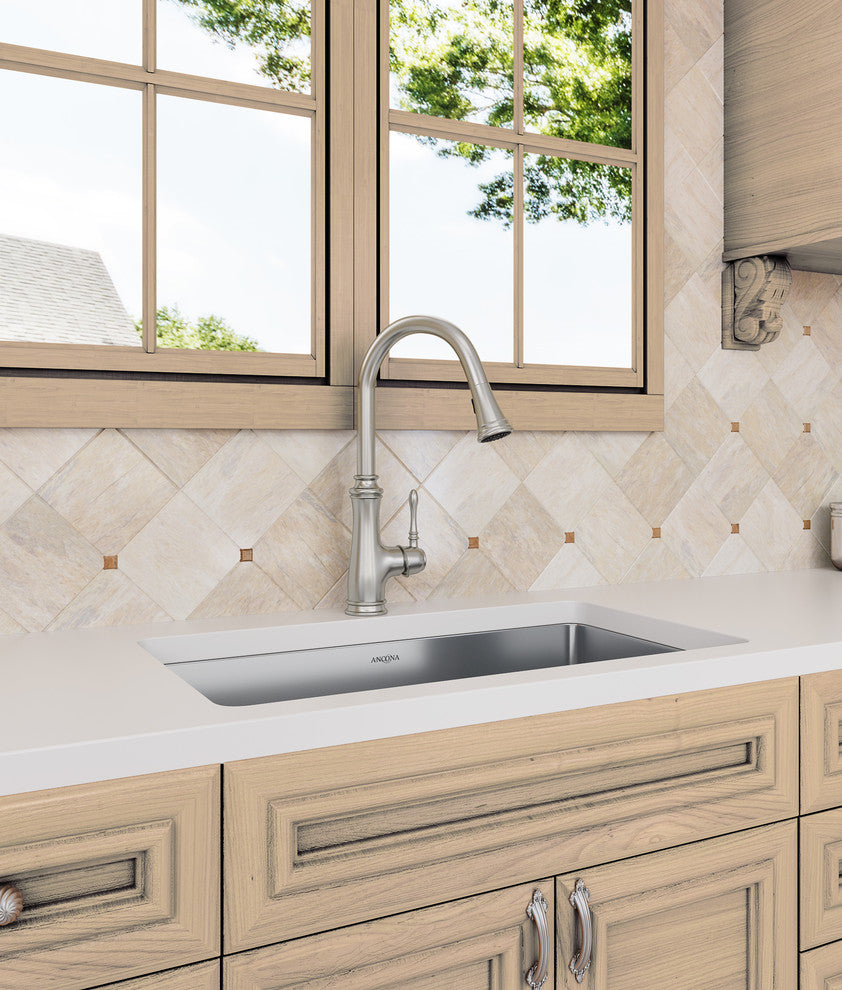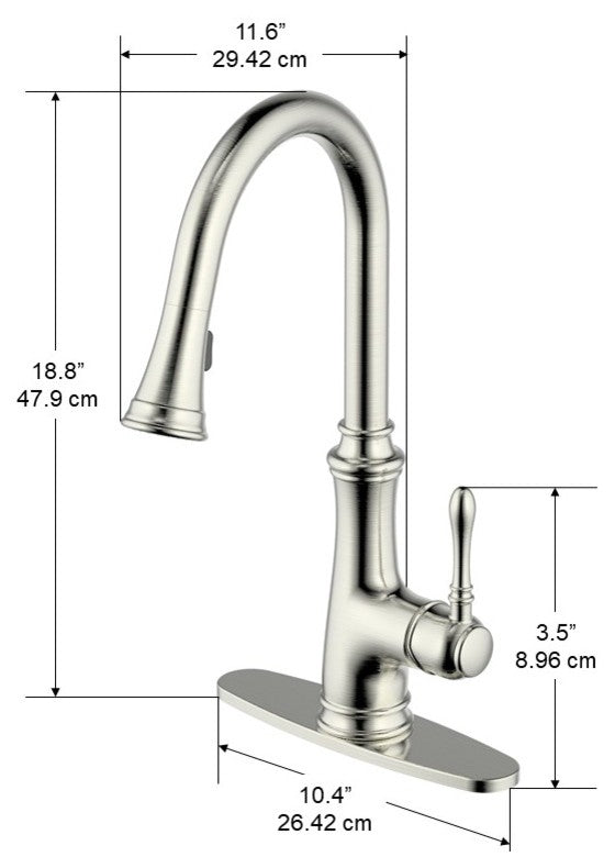 Make kitchen tasks easier and more stylish with the Ancona Villa Single Handle Pull-out Faucet. Featuring a pull-out dual function spout which allows you to move from a strong stream for washing cookware and filling oversized pots to a spray for rinsing delicate produce with the simple push of a button. This solid brass faucet beautifully hand finished in multi-layered brushed nickel is designed for elegance and long-lasting durability to help you create the kitchen of your dreams.