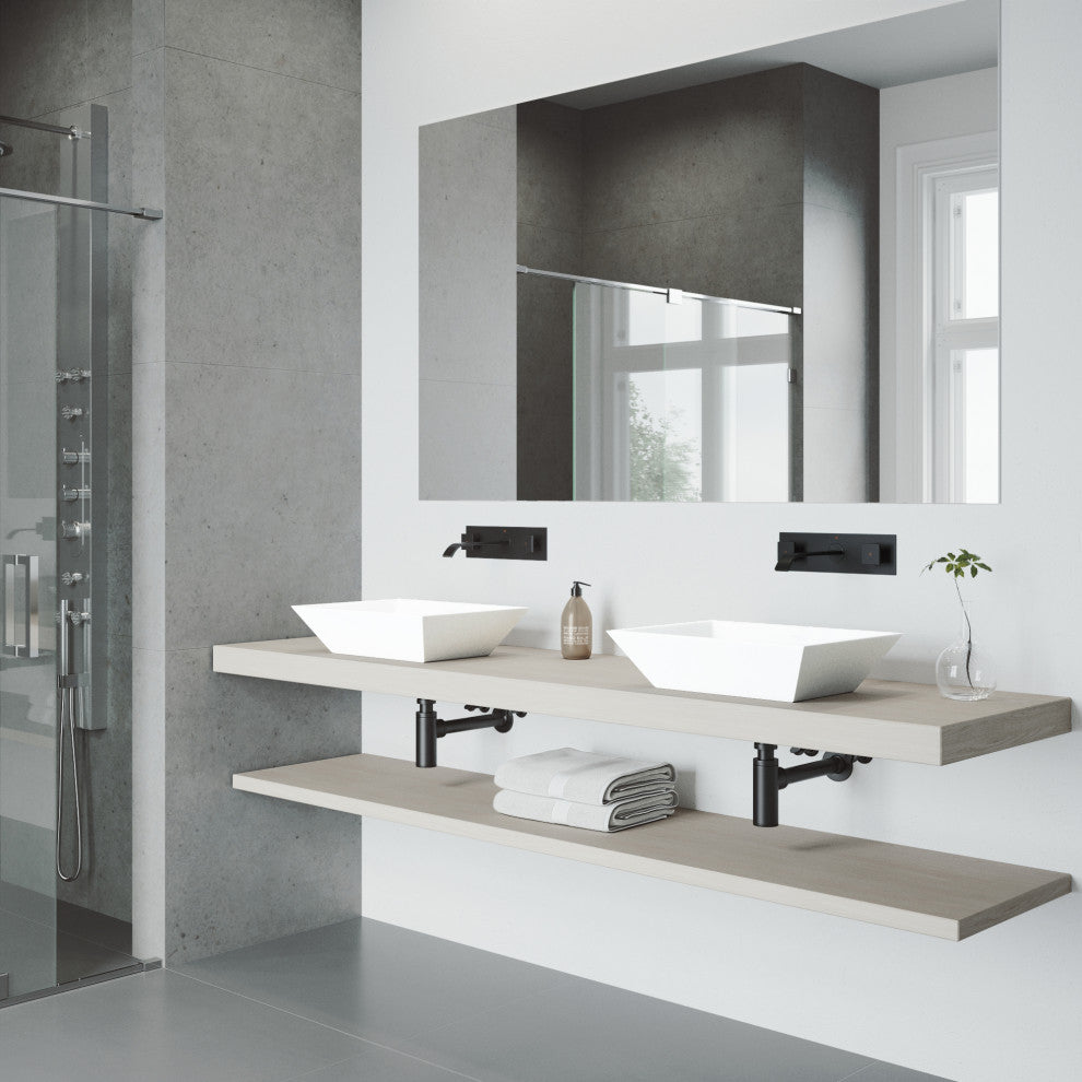 This retro inspired Vinca Matte Stone Bathroom Sink, crafted entirely of a seamless PMMA, is a statement piece in any modern bathroom space. With rectangular face plate and elongated tapering spout, the included Titus Wall Mount Faucet lends an industrial appeal to the set, making it a statement in your modern bathroom space. Wall mount faucet install and countertop mount sink create a modern look in any home Set includes all mounting hardware for sink and faucet Sink constructed from VIGO''s proprietary Matte Stone, a seamless, solid PMMA VIGO Matte Stone Vessel Sinks are hand-polished with a unique matte finish Solid brass construction makes this faucet durable and easy to clean Premium matte black finish resists corrosion and tarnishing All VIGO Bathroom Sinks and Faucets feature a quality assured Limited Lifetime Warranty Sink VG04007 Details Hand-polished finish Above counter installation Smooth, rounded corners for easy cleaning Impact and scratch resistant, fire retardant Non-porous surface prevents discoloration and fading White matte stone is constructed of seamless, solid core PMMAVessel Sink Measurements Exterior Height: 4 5/8 Exterior Width: 13 3/4 Exterior Length: 18 Interior Width: 12 1/4" Interior Length: 16 3/4 Standard 1 3/4 drain openingFaucet VG05002MB Details 1.2 gpm flow rate, not recommended for use with bathtubs Dual-hole installation Dual lever water and temperature control Water pressure tested for industry standard Hot washerless brass cartridge Cold washerless brass cartridge Nozzle resists mineral buildup and is easy to clean All mounting hardware and hot/cold waterlines included Solid brass construction with matte black finish VIGO finishes resist corrosion and tarnishing, exceeding industry durability standardsWall Mount Faucet Measurements Spout reach: 8 1/4" Faceplate width: 11 Faceplate height: 3 1/8" Handle center to handle center: 8 Standard US plumbing 3/8" connections Standard 1 3/8" diameter opening is required for this faucetAccessory IncludedVessel Sink Pop-up DrainCertifications & Warranty All VIGO bathroom sinks and faucets have a Limited Lifetime Warranty All VIGO bathroom sinks, faucets and accessories are cUPC certified All VIGO bathroom faucets are NSF-61, AB1953, WaterSense certified by IAPMO Sink and faucet are ADA compliant All VIGO bathroom hardware has a Limited Lifetime Warranty