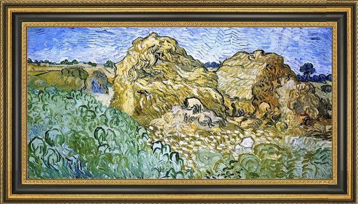 15" x 30" Vincent Van Gogh Field with Stacks of Wheat framed premium canvas print reproduced to meet museum quality standards. Our Museum quality canvas prints are produced using high-precision print technology for a more accurate reproduction printed on high quality canvas with fade-resistant, archival inks. Our progressive business model allows us to offer works of art to you at the best wholesale pricing, significantly less than art gallery prices, affordable to all. This artwork is hand stretched onto wooden stretcher bars, then mounted into our 3 3/4" wide gold finish frame with black panel by one of our expert framers. Our framed canvas print comes with hardware, ready to hang on your wall. We present a comprehensive collection of exceptional canvas art reproductions by Vincent Van Gogh.