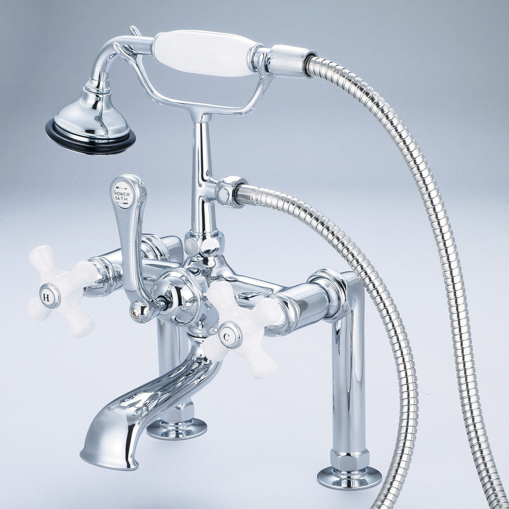 Vintage 7" Spread Deck Mount Tub Faucet w/6" Risers & Handshower, Cross handles