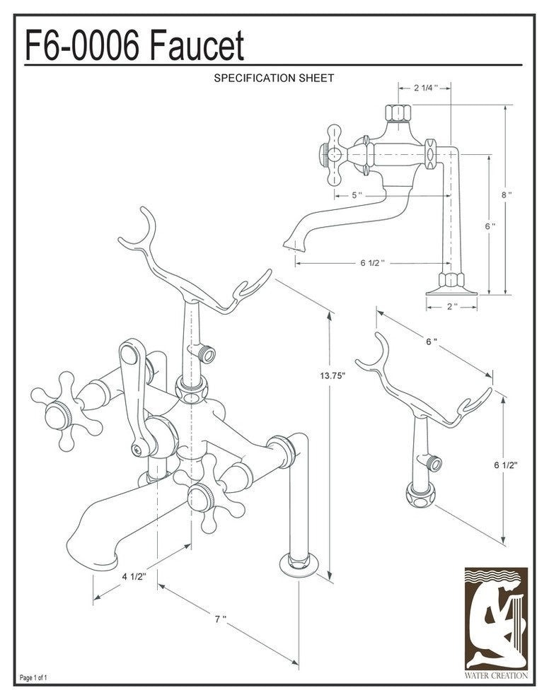 Bring the luxury and elegance of yesteryear to your bathroom with the Vintage Deck-Mount Tub Faucet. It is crafted from solid brass and available in a range of finishes and handle types. It features a hand-held shower and a specially designed faucet to avoid a restricted water flow. Bring a subtle glamour to any space with designs from Water Creation. 0.5" male fittingCeramic disc cartridges Flow rate: 4.85gpm at 60 psiHose length: 60"Faucet centers: 7"Deck mount