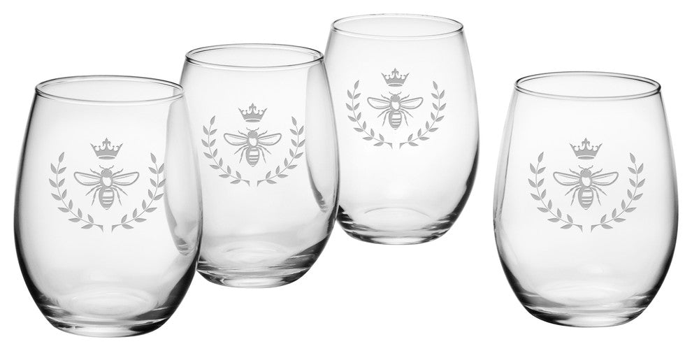 Versatile enough for water, wine, and juice, each 21-ounce stemless tumbler in this set of four features the same deeply sand etched vintage bee design. The stemless shape makes them dishwasher safe and less prone to breakage than their stemmed counterparts. They''re certain to add a French country feel to the home glassware collection. Made and decorated in the USA.