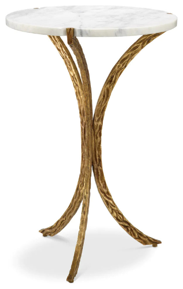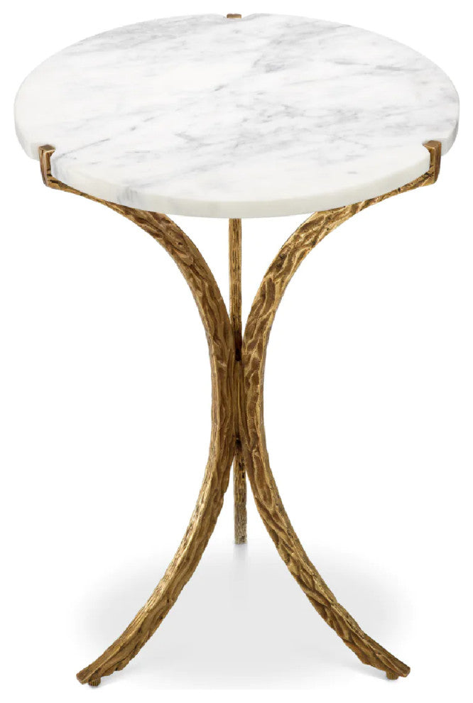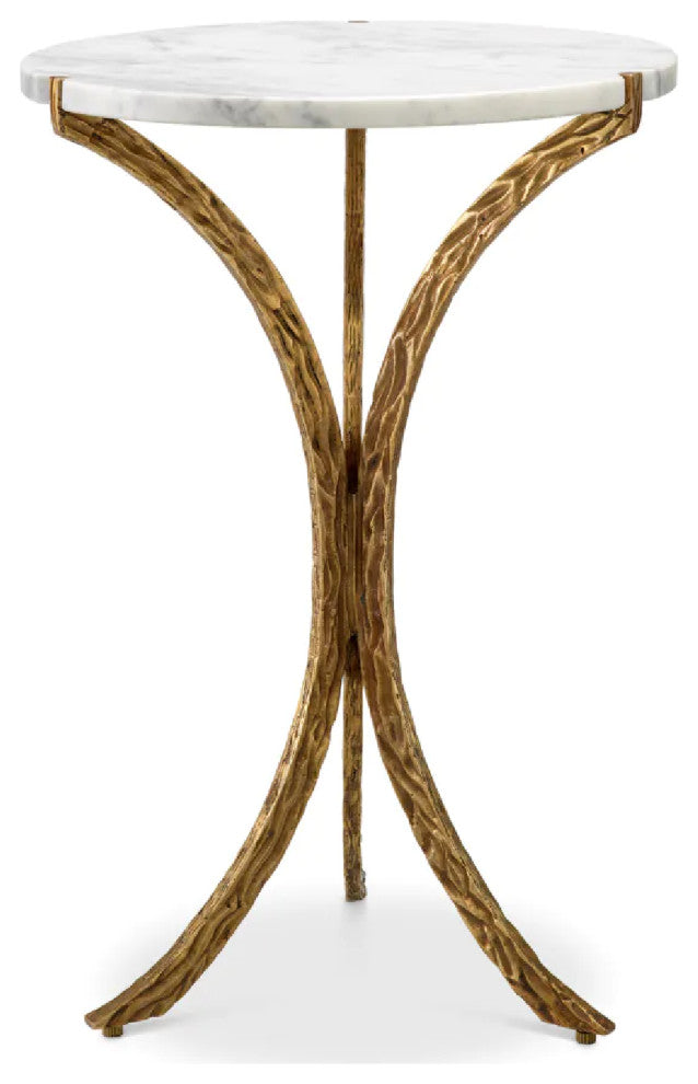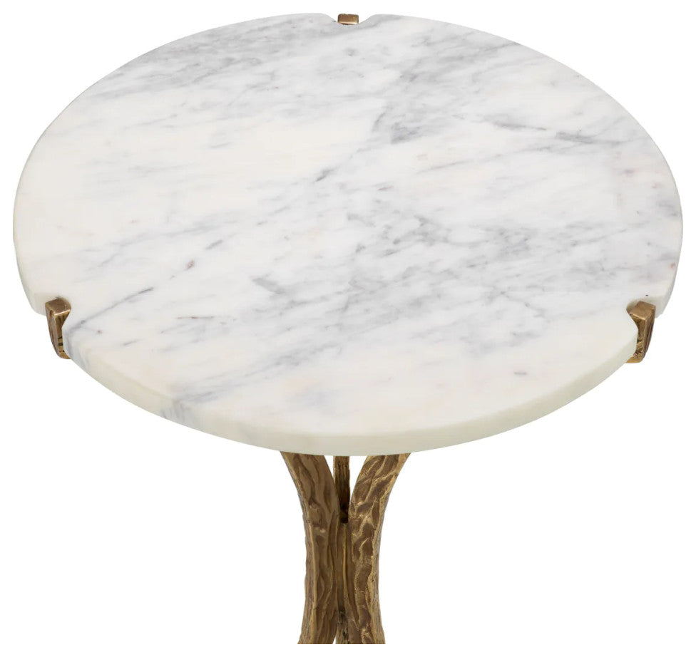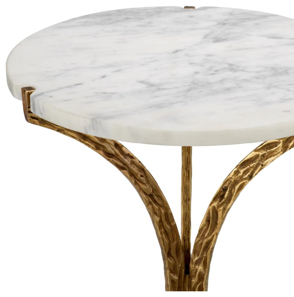Discover the Emmeline Side Table, where luxury and artistry converge. A refined white marble top rests atop a gracefully hammered vintage brass base, offering an elegant fusion of timeless materials. This sophisticated piece enhances any space with its striking balance of texture and grandeur, epitomizing high-end elegance for the discerning connoisseur.