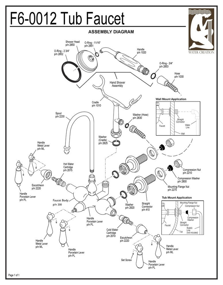Water Creation''s collection of premier vintage clawfoot bathtub fillers will transform any bathroom''s decor to the luxury and elegance of yesteryear. The crossroads of timeless design and an innovative modern manufacturing processes merge harmoniously to ensure each filler''s finishes and function are as reliable as their unmistakable beauty. Made of 100% brass and adorned with a porcelain shower handle, the heavy weight of Water Creation''s clawfoot bathtub fillers lends credence to the durability and superior craftsmanship that Water Creation is known for. With the understanding that no one customer is alike, Water Creation has gone the extra mile to ensure satisfaction by giving customers the power to customize the handle style of their clawfoot bathtub fillers. Simply select the style that meets your preferences and start enjoying a world-class tub filler that you had a hand in creating. Features:- Premier clawfoot tub filler with hand shower- Solid brass construction- 3.65 gpm at 60 psi flow rate- Lifetime Warranty 1/4 turn drip free ceramic disc cartridges- Matching finish handheld shower included- Vacuum breaker backflow prevention- Solid brass 5 foot coiled hose in matching finish - Designed to meet 100 psi water test pressure- Easy to install 1/2" male fitting- Great for replacing an existing roman tub filler- Arched spout allows code compliant installation- Matching glass accessories available - Available in triple plated chrome, brushed nickel, oil rubbed bronze, and polished nickel PVD finishes- Available in lever, "Hot" and "Cold" labeled porcelain lever, and porcelain lever handle styles Specifications:- Overall Product Height: 12-1/2"- Hose Length: 60"- Spout Reach: 8-3/8"- Faucet Centers: 3-3/8"- Flow Rate: 3.65 GPM at 60PSI- Weight: 8 lbs.- Material: Solid Brass- Handles Included?: Yes- Number of Handles: 2- Installation Type: Wall or inside bathtub mount- Valve Type: Ceramic disc- Number of Faucet Holes Required for Installation: 2Flow rate for Faucet: 4.4 GPM at 20PSI