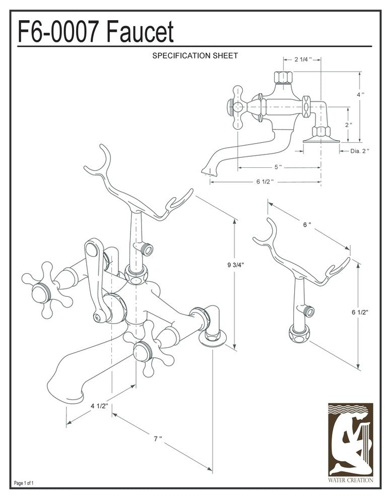 Water Creation''s collection of premier vintage clawfoot bathtub fillers will transform any bathroom''s decor to the luxury and elegance of yesteryear. The crossroads of timeless design and an innovative modern manufacturing processes merge harmoniously to ensure each filler''s finishes and function are as reliable as their unmistakable beauty. Made of 100% brass and adorned with a porcelain shower handle, the heavy weight of Water Creation''s clawfoot bathtub fillers lends credence to the durability and superior craftsmanship that Water Creation is known for. With the understanding that no one customer is alike, Water Creation has gone the extra mile to ensure satisfaction by giving customers the power to customize the handle style of their clawfoot bathtub fillers. Simply select the style that meets your preferences and start enjoying a world-class tub filler that you had a hand in creating. Features:- Premier clawfoot tub filler with hand shower- Solid brass construction- 4.85 gpm at 60 psi flow rate- Lifetime Warranty 1/4 turn drip free ceramic disc cartridges- Matching finish handheld shower included- Vacuum breaker backflow prevention- Solid brass 5 foot coiled hose in matching finish - Designed to meet 100 psi water test pressure- Easy to install 1/2" male fitting- Great for replacing an existing roman tub filler- Special designed spout to avoid a restricted flow- Matching glass accessories available - Available in triple plated chrome, brushed nickel, oil rubbed bronze, and polished nickel PVD finishes- Available in lever, cross, "Hot" and "Cold" labeled porcelain lever, porcelain lever, and porcelain cross handle styles Specifications:- Overall Product Height: 9-3/4"- Hose Length: 60"- Spout Reach: 6-1/2"- Faucet Centers: 7"- Flow Rate: 4.85 GPM at 60PSI- Max Deck Thickness: 1-1/4"- Weight: 9 lbs.- Material: Solid Brass- Handles Included?: Yes- Number of Handles: 2- Installation Type: Deck mount- Valve Type: Ceramic disc- Number of Faucet Holes Required for Installation: 2Flow rate for Faucet: 6.3 GPM at 20PSI