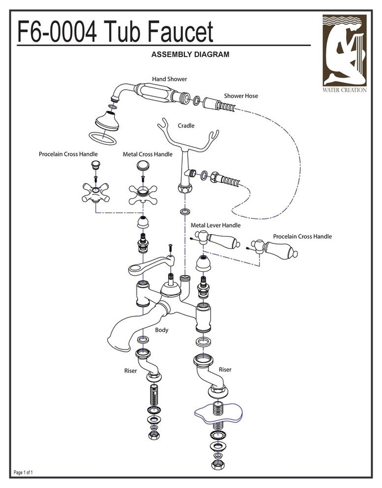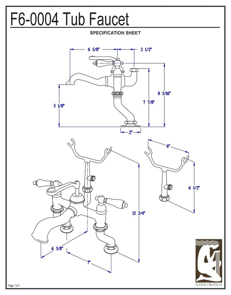 The Classic Vintage Deck-Mount Faucet brings classic elegance to your bathroom. This solid brass faucet is well-suited to a claw-foot bathtub. This elegant fixture comes with a choice of handles and finishes. Water Creation combines classic designs with state-of-the-art features. Adjustable spread between 4" and 12"5-foot solid brass coiled hoseLifetime warrantyHandles included: YesNumber of handles: TwoCeramic disksTwo faucet holes required for installation