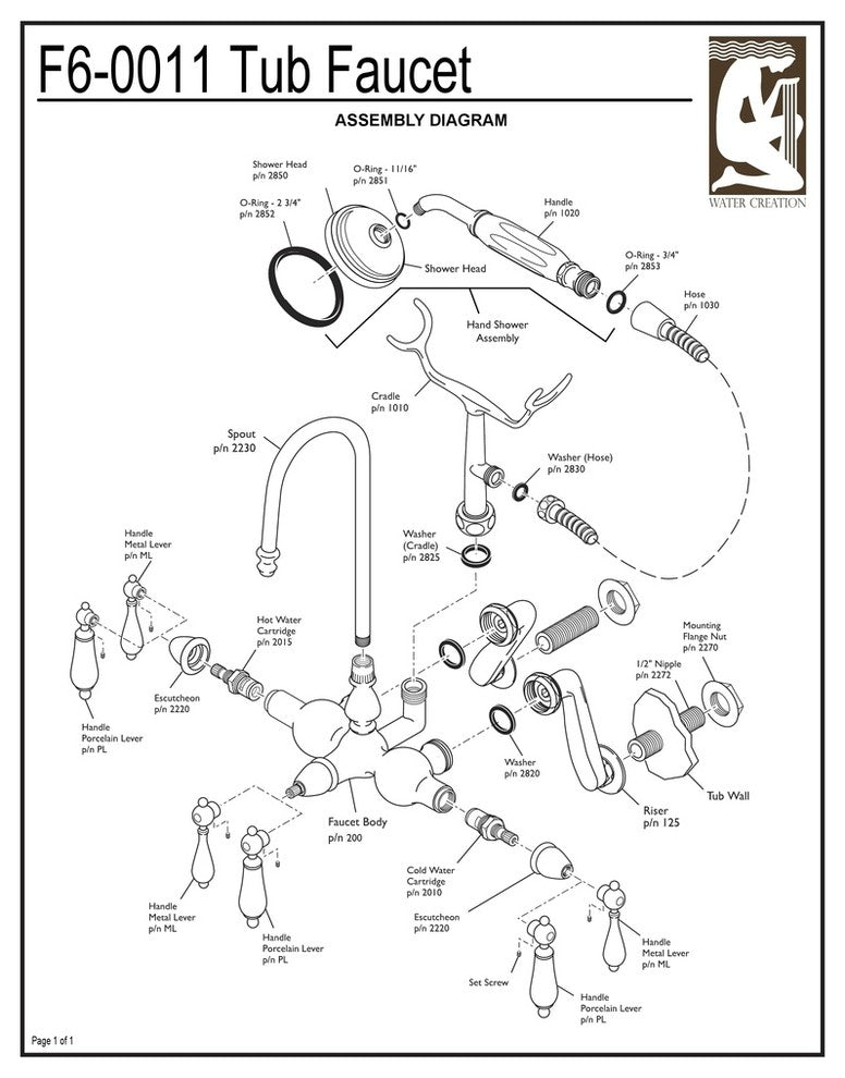 Water Creation''s collection of premier vintage clawfoot bathtub fillers will transform any bathroom''s decor to the luxury and elegance of yesteryear. The crossroads of timeless design and an innovative modern manufacturing processes merge harmoniously to ensure each filler''s finishes and function are as reliable as their unmistakable beauty. Made of 100% brass and adorned with a porcelain shower handle, the heavy weight of Water Creation''s clawfoot bathtub fillers lends credence to the durability and superior craftsmanship that Water Creation is known for. With the understanding that no one customer is alike, Water Creation has gone the extra mile to ensure satisfaction by giving customers the power to customize the handle style of their clawfoot bathtub fillers. Simply select the style that meets your preferences and start enjoying a world-class tub filler that you had a hand in creating. Features:- Premier clawfoot tub filler with hand shower- Solid brass construction- 3.65 gpm at 60 psi flow rate- Lifetime Warranty 1/4 turn drip free ceramic disc cartridges- Matching finish handheld shower included- Vacuum breaker backflow prevention- Solid brass 5 foot coiled hose in matching finish - Designed to meet 100 psi water test pressure- Easy to install 1/2" male fitting- Great for replacing an existing roman tub filler- Arched spout allows code compliant installation- Matching glass accessories available - Available in triple plated chrome, brushed nickel, oil rubbed bronze, and polished nickel PVD finishes- Available in lever, "Hot" and "Cold" labeled porcelain lever, and porcelain lever handle styles Specifications:- Overall Product Height: 9-1/2"- Hose Length: 60"- Spout Reach: 9-1/4"- Faucet Centers: Adjustable 3-3/8" to 8-3/4"- Flow Rate: 3.65 GPM at 60PSI- Weight: 8 lbs.- Material: Solid Brass- Handles Included?: Yes- Number of Handles: 2- Installation Type: Wall or inside bathtub mount- Valve Type: Ceramic disc- Number of Faucet Holes Required for Installation: 2Flow rate for Faucet: 4.4 GPM at 20PSI