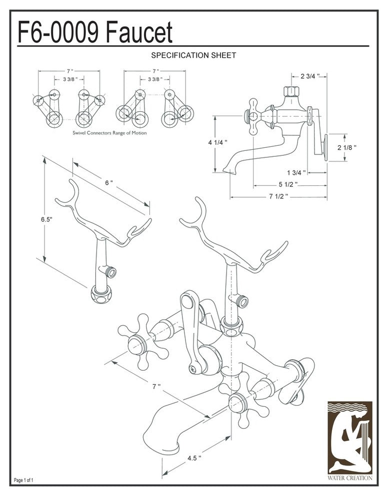 The oil rubbed bronze Vintage Classic Bath and Handshower Faucet from Water Creation lends a regal appearance to a family bathroom. Its 60-inch matching finish hose allows easy reach to rinse off bath foam and can be coiled up on its hook when not in use. Featuring two cross-handled faucets, a water-flow lever and a wide spout, this wall-mounted brass fitting with porcelain accents completes a nostalgic look that complements a claw foot bathtub. Adhering to the highest quality standards and attention to detail, Water Creation is synonymous with timeless elegance.Wall-mounted bath and handshower faucet with cross handlesWater flow rate: 4.85 gal/min at 60 PSIMeets 100 PSI water pressure test1/4 turn drip-free ceramic disc cartridgesVacuum breaker backflow preventionSolid brass, 5-foot coiled hoseEasy-to-install 0.5" male fittingSpout Reach: 7.5"Faucet Centers: Adjustable 3-3/8" to 7" Number of Faucet Holes Required for Installation: 2 Lifetime Warranty