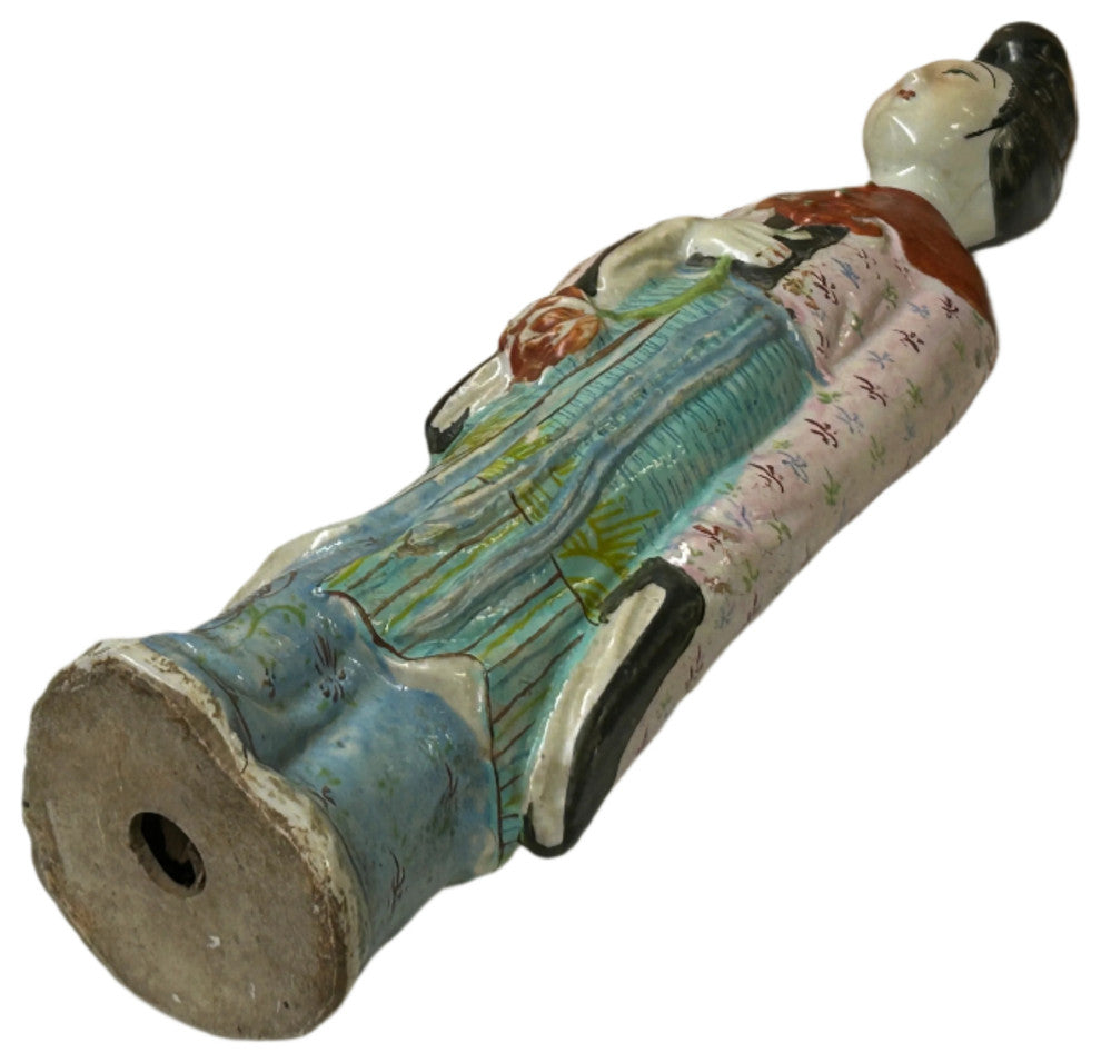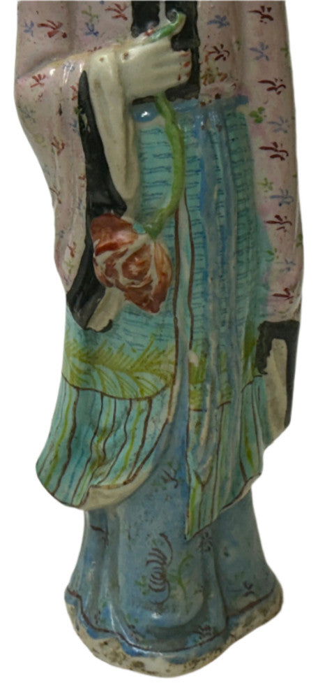 Discover the serene elegance of this vintage Chinese porcelain figure, a captivating piece of artistry steeped in history. This exquisite figurine showcases a gracefully poised woman in traditional attire, featuring a flowing robe in muted blues and intricate detailing, topped with a meticulously styled high bun. The delicate hand-painted features and subtle coloration evoke a sense of tranquility and timeless beauty. Perfect for collectors of Asian art or as a sophisticated accent in any home, this vintage Chinese porcelain figure brings a touch of Eastern charm and cultural richness to your decor. Embrace a piece of history and elevate your space with this remarkable treasure.Dimensions: 3" x h12.25"Origin: China Material: PorcelainCondition: minor distressed vintage marks, no crack, no damageWork: 40+ yearsFor all USA domestic continental customers (from 48 states), there is a flat shipping fee of $35, which includes insurance and handling charges. (Additional shipping charges apply to buyers from Hawaii, Alaska, US Islands, Florida Keywest, and Canada). If you are in the San Francisco Bay Area, we warmly encourage you to take advantage of our convenient in-store pick-up option at no extra cost. Please keep all original packing material and box if damage happens.