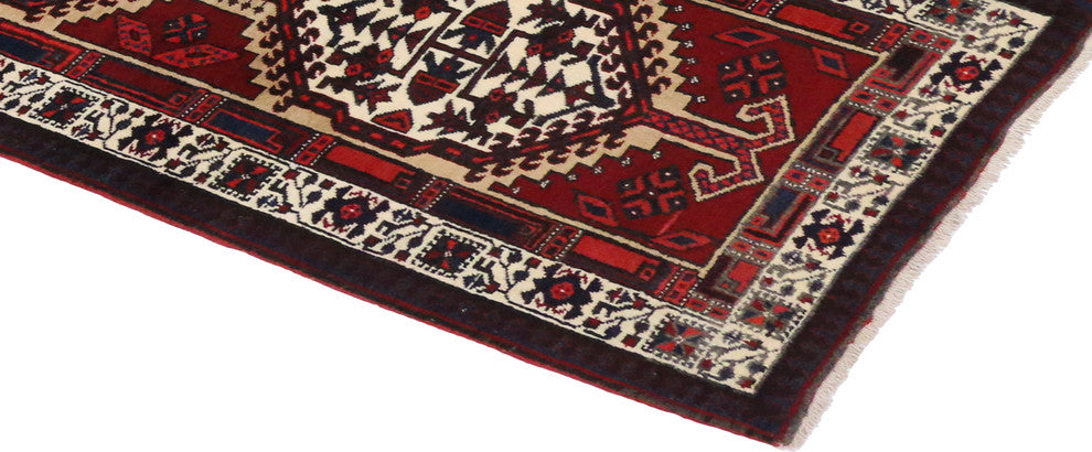 Hand-knotted wool vintage Persian Heriz carpet runner featuring large-scale stacked medallions along the red field surrounded by a contrasting ivory border. Full of character and stately presence, this Persian carpet runner showcases an extravagant geometric design and tribal motifs. Showcasing an intrinsic geometric pattern, this charismatic carpet runner highlights a well-balanced and symmetrical composition. Detailed with fine contrasting outlines, every element of the composition is brought into sharp focus against the red field. With its subtle beauty combined with an appealing geometric pattern, this vintage Heriz carpet runner pairs well with Mid-Century Modern design and seamlessly blends with eclectic interiors. Hand-knotted wool. Made in Iran (Persia). Date: 1950-1959.