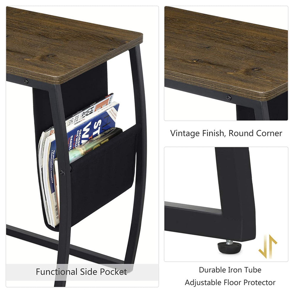 This End Table which embodies vintage design, functionality and durability must be a perfect choice. The matte-black iron frame and vintage-finish wood tabletop make this end table a rustic and elegant piece which will suits any room decor. C-shaped table is a smart solution for small spaces, which works great as a sofa table, end/side table, coffee table, snack table or laptop table. Functional side pocket keeps your newspapers, magazines and books organized and gives a neat look.
