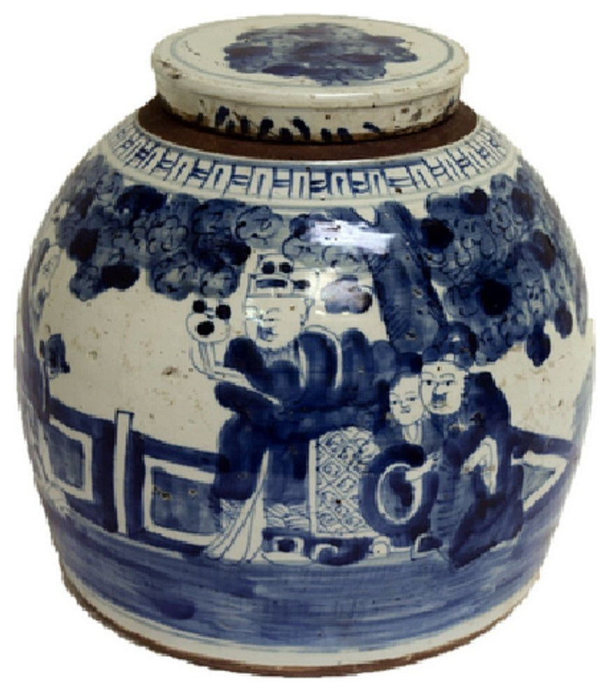 Vintage Style Blue and White Porcelain Lidded Ginger Jar 8 Immortals 11"