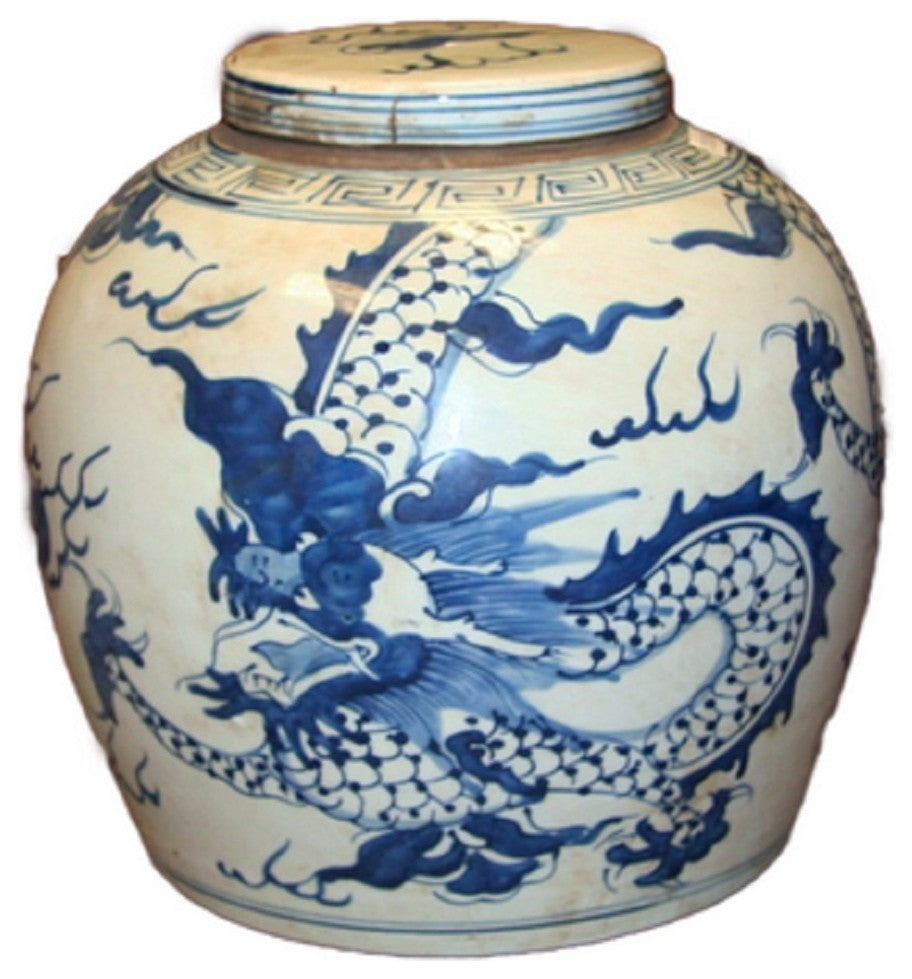 Vintage Style Blue and White Porcelain Lidded Ginger Jar Dragon Motif 9"