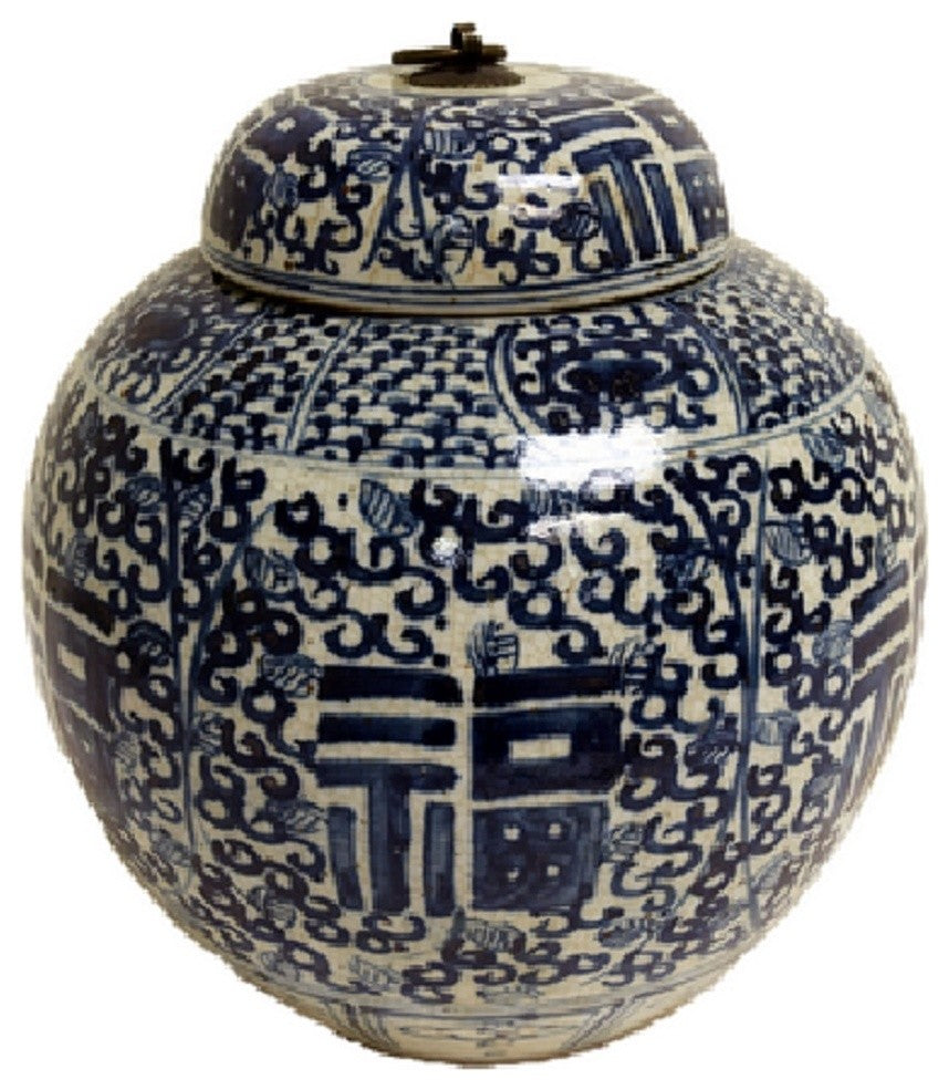 Vintage Style Blue and White Porcelain Lidded Ginger Jar Lucky Motif 10"