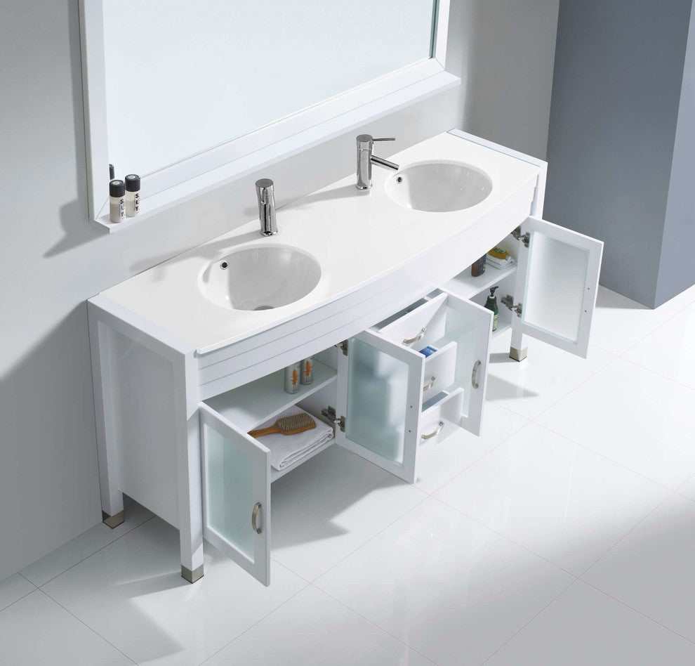 The Ava vanity offers modern clean-lined sophistication and classic warmth. The vanity''s constructed from solid oak wood. Glass inserts add character and beauty to his and her cabinet doors. Never hear a door slam again with the included soft closing hinges. The vanity''s finished with an elegant White color and is available with multiple countertop options. The vanity set comes complete with a matching mirror and equipped with eco-friendly, lifetime warranty faucets. The Ava vanity''s a centerpiece to any bathroom design. Virtu USA has taken the initiative by changing the vanity industry and adding soft closing doors and drawers to their entire product line. The premium soft-closing hardware not only increases the safety of the vanity, but also its lifetime reliability.Materials: White Stone, Brushed Nickel HardwarePurchase Includes: Single 71" x 31.6" MirrorWhite Stone CountertopWhite Round Basin, Polished Chrome Faucet