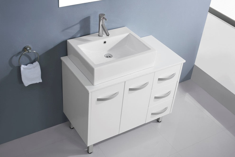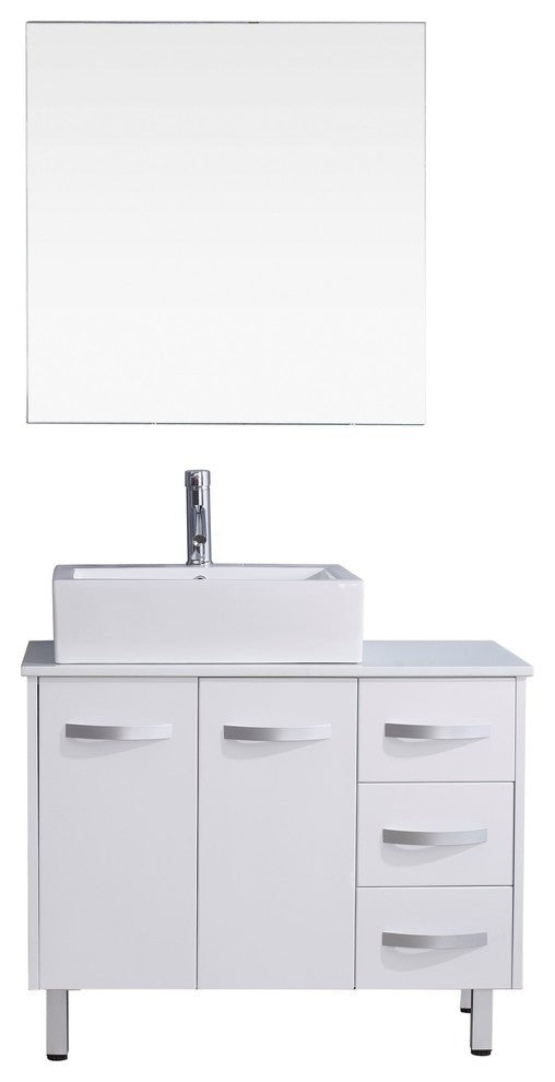 The features, of the Tilda vanity, emphasize a bold and modern design. An oversized ceramic basin highlights the beauty and balanced with full size mirror. An artificial white stone countertop further enhances the contemporary concept. The Tilda is finished in Espresso and is accented with brushed nickel cabinet pulls. The cabinet rests on free standing legs and comes complete with an Eco-friendly lifetime warranty faucet. This vanity set will compliment any bathroom style. Virtu USA has taken the initiative by changing the vanity industry and adding soft closing doors and drawers to their entire product line. The premium soft-closing hardware not only increases the safety of the vanity, but also its lifetime reliability.Materials: White Stone, Brushed Nickel HardwarePurchase Includes: Single 35.1" x 35.7" x 0.46" MirrorWhite Stone CountertopWhite Square Basin, Polished Chrome Faucet