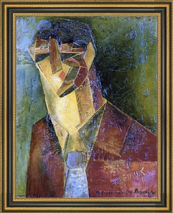 18" x 24" Vladimir Burliuk Portrait of the Poet Benedict Livshits framed premium canvas print reproduced to meet museum quality standards. Our Museum quality canvas prints are produced using high-precision print technology for a more accurate reproduction printed on high quality canvas with fade-resistant, archival inks. Our progressive business model allows us to offer works of art to you at the best wholesale pricing, significantly less than art gallery prices, affordable to all. This artwork is hand stretched onto wooden stretcher bars, then mounted into our 3 3/4" wide gold finish frame with black panel by one of our expert framers. Our framed canvas print comes with hardware, ready to hang on your wall. We present a comprehensive collection of exceptional canvas art reproductions by Vladimir Burliuk.