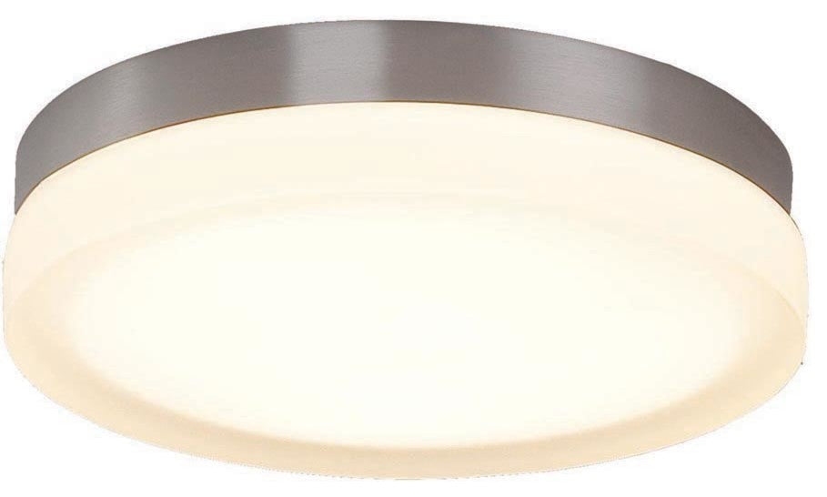 9``Flush Mount from Slice collection in Brushed Nickel finish.. No bulbs included. A modern racetrack design blending white opal glass with an interior ceramic glaze. Brilliant ambient lighting for a wide range of spaces in residential and commercial environments. Versatile design, mounts on walls and ceilings. Perfect as the sole light source in a room mounted to a ceiling or intriguing as a wall sconce. No UL Availability at this time.