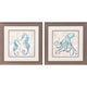 A set of two blue ocean animals are double matted with a neutral top mat. They are framed in a rustic wood-grain finish molding.