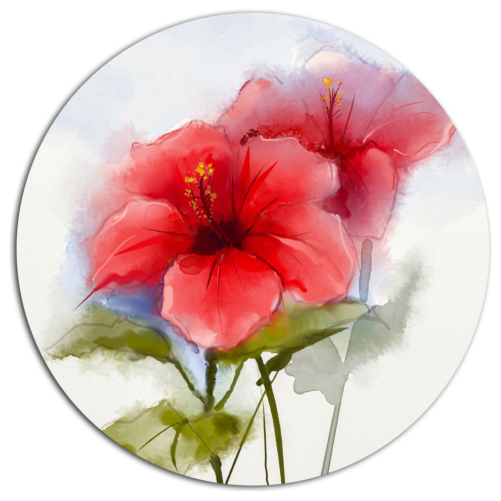 Bring Contemporary Abstraction to your home with this large Circle Metal wall art. This Watercolor Painting Red Hibiscus Flower Metal Artwork makes it the focal point of any room or office.