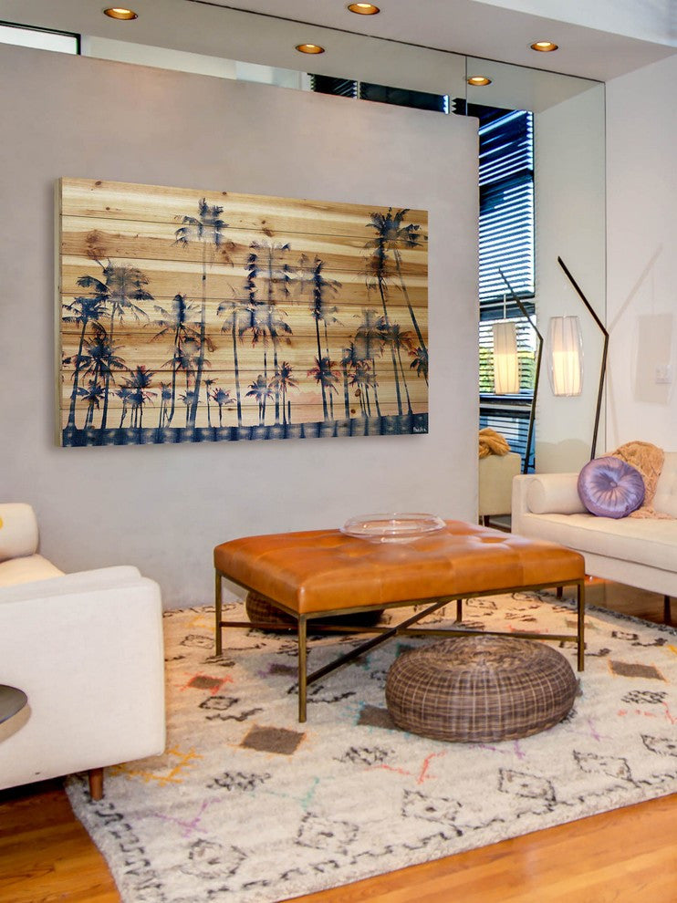 Striking and unique, the "Watercolor Palms" Print on Natural Pine Wood by Parvez Taj will bring your walls to life. Printed on natural pine wood, this 45 inch wide by 30 inch tall tropical artwork will make a statement in any living room, dining room, or bedroom.- Fine art print on natural pine by Parvez Taj- wood pieces are hand-selected by Fine craftsmen for printing- Arrives ready to hang- Includes a certificate of authenticity- Artist signature on the front
