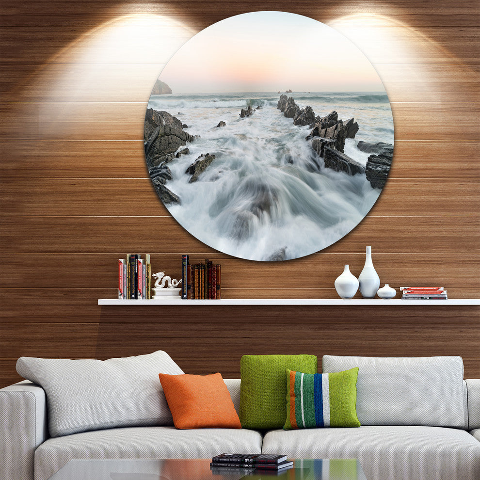 Bring Contemporary Abstraction to your home with this large Circle Metal wall art. This Waves Hitting Beach at Sunrise Atlantic Metal Artwork makes it the focal point of any room or office.