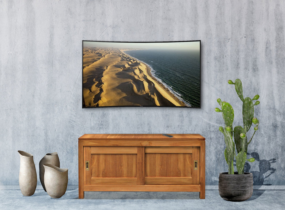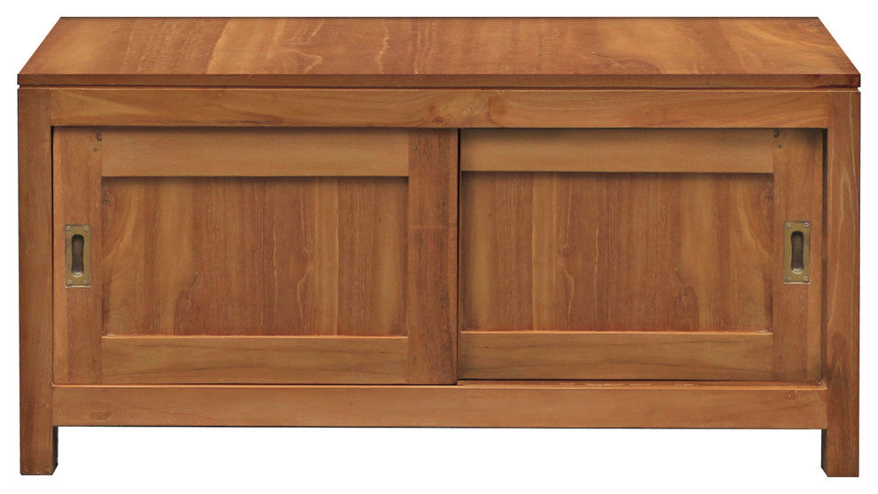 Beautiful low profile media center that will display your flat screen TV to the fullest. Handmade from solid teak wood with a hand rubbed wax finish.Behind the two sliding doors you will find shelves in the middle of the compartments for storage of all your audio and video components.This Waxed Teak Oakland Media Center is crafted from solid grade A teak wood which makes it sturdy and versatile enough to accommodate just about any size HDTV plus all of your media components. The natural finish and gorgeous wood grains make this media center really stand out! Features:Solid A-grade teak wood2 large cabinets with sliding doorsSpacious shelves for media componentsDurable constructionHand rubbed wax finishHandmade by skilled artisansComes fully assembledPremium hardwareMade to lastSturdy design for commercial or residential useCan be used indoors or outdoors in a fully covered and dry areaPlease note that we do not pre-drill wiring holes in the back since not all clients will use this as a media centerThe Waxed Teak Oakland Media Center has dimensions of 38.5" (w) x 20" (d) x 19.5"(h).Top Shelf: 5.5H x 17W x 16.5D in.Bottom Shelf: 6H x 17W x 16.5D in.Total Cabinet(shelves are removable): 12H x 17W x 16.5D in.