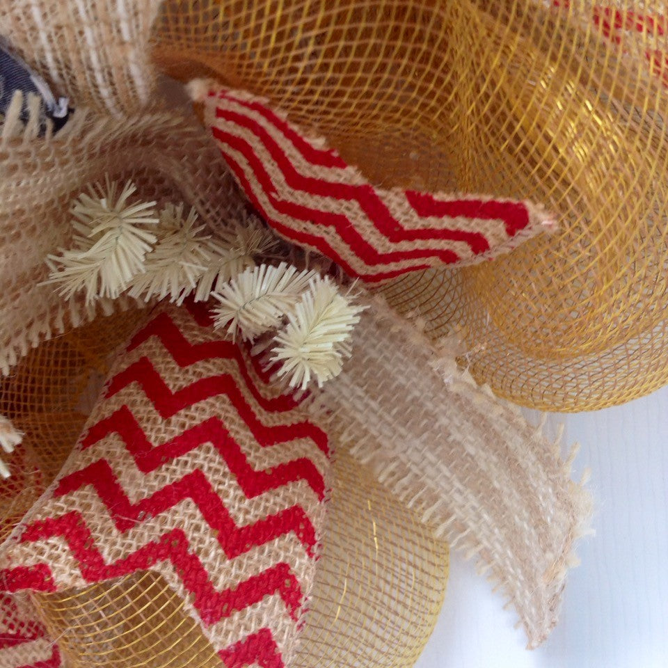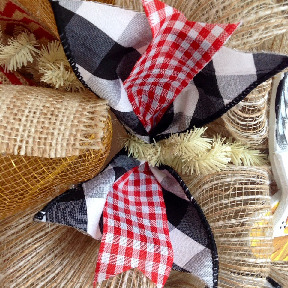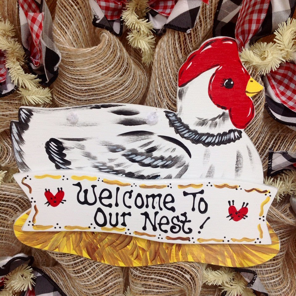 Full! New! Premium! Handmade All Season Deco Mesh Kitchen or Door Wreath. Colors are beautiful shades of red, black, cream and harvest gold. A large, wood "Welcome to Our Nest" sign rests on creamy beige and white striped deco mesh and natural jute. The sign is shaped in the form of a hen and is hand painted. The inner ring has white and black checked ribbons along with red gingham ribbons. The outer ring is made of harvest gold deco mesh and has cream and beige striped frayed burlap and red and burlap chevron ribbons. Measurement is a large 24 inches and approximately 6 inches deep. See photo for size comparison. Perfect addition to a cozy kitchen or door wreath. "¨